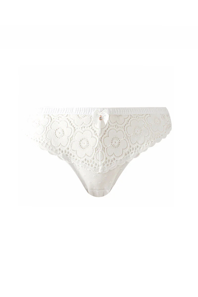 DESCRIPTIONSlip en dentelle signature, maxi fleur texturée Tulle plumetis Noeuds gros-grain et strass à la ceintureFond doublé d’un gousset 100% cotonDisponible du 36 au 48 COMPOSITIONDentelle : 87% Polyamide 13% Elasthanne Matière secondaire: 88% Polyamide 12% Elasthanne Gousset : 100% Coton Bande élastique : 83% Polyamide 17% Elasthanne