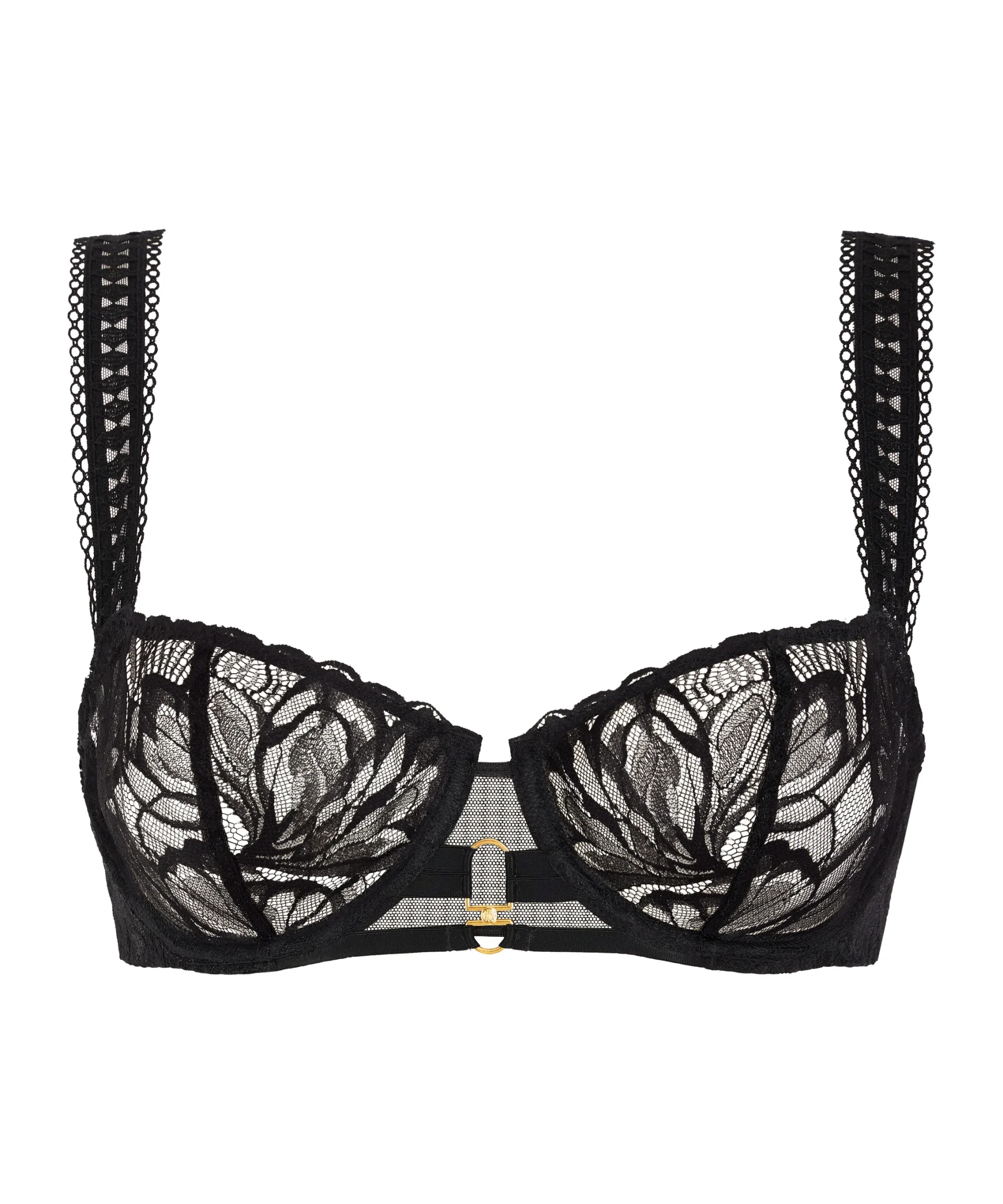 Sublimant en tout confort le galbe naturel de la poitrine de sa dentelle florale transparente et envoûtante, le soutien-gorge corbeille armatures After Hours offre un décolleté ouvert et sexy, souligné à l’entregorge par un bijou doré. Sur les bretelles, il se pare d’une guipure ajourée aux motifs graphiques résolument contemporains.