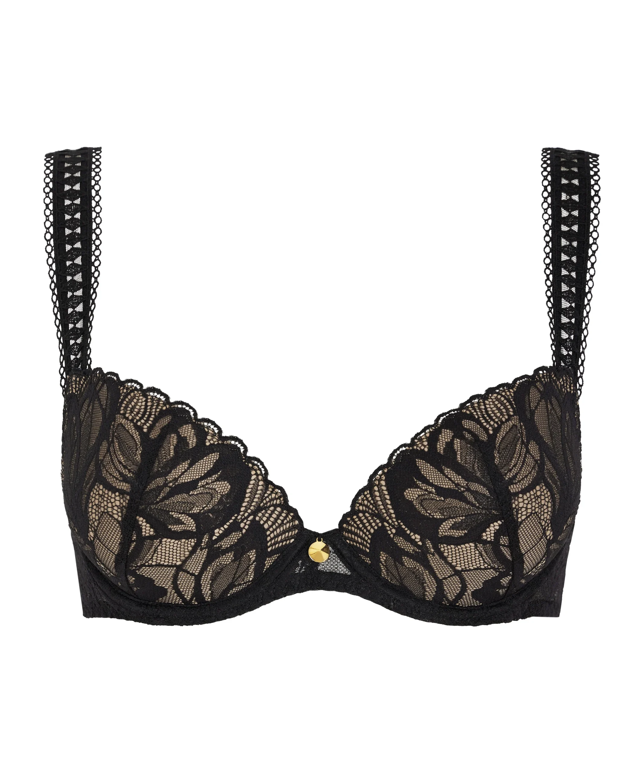 Offrant un décolleté profond, naturellement galbé grâce à ses coques invisibles intégrées, le soutien-gorge plunge coque After Hours associe confort et séduction. Tout en dentelle sexy, il se pare d’un bijou doré à l’entregorge, d’une guipure graphique résolument moderne sur les bretelles et de liens très sensuels dans le dos.