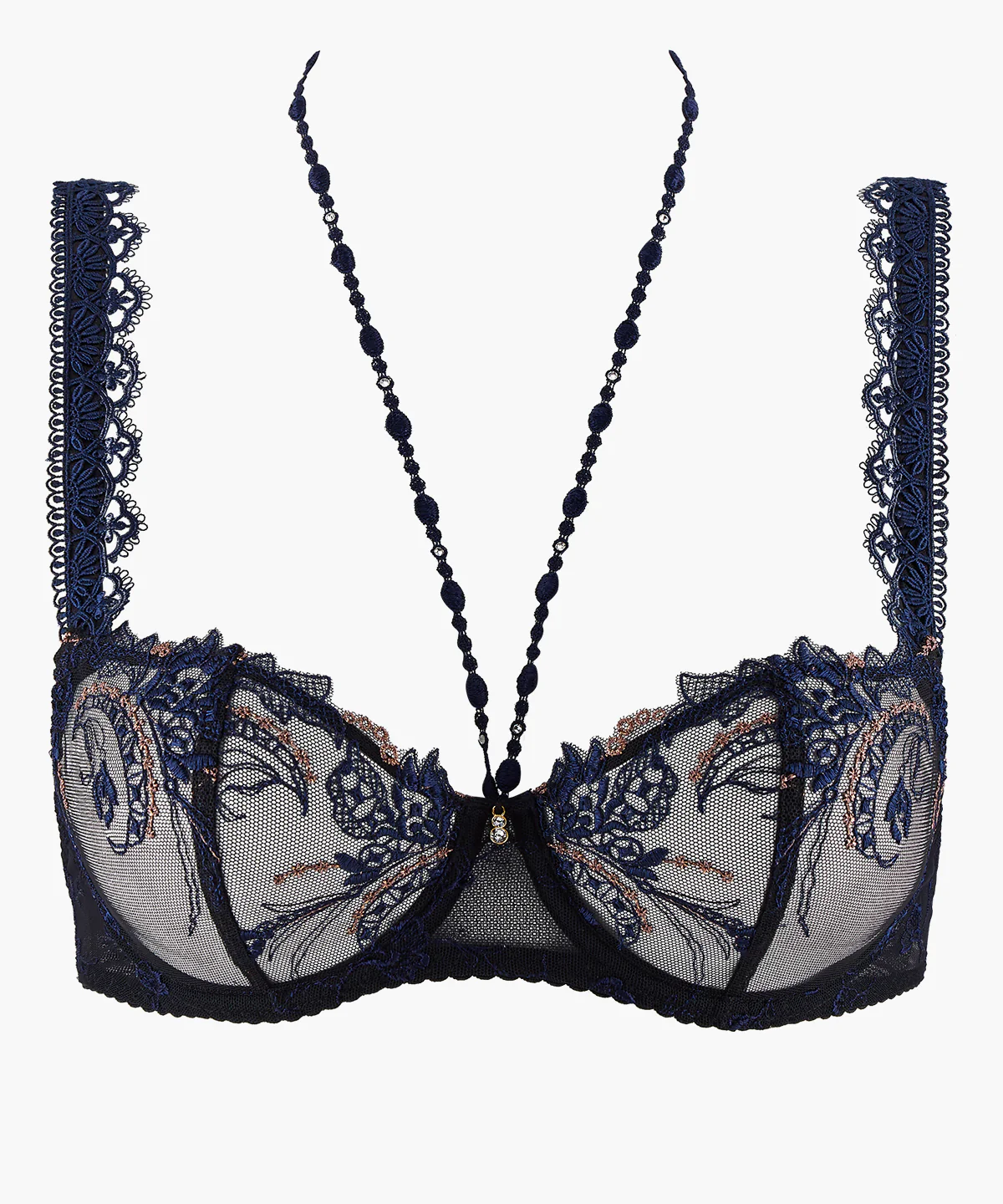 - Une bande de guipure au dessin ornementl vient enrichir les bretelles