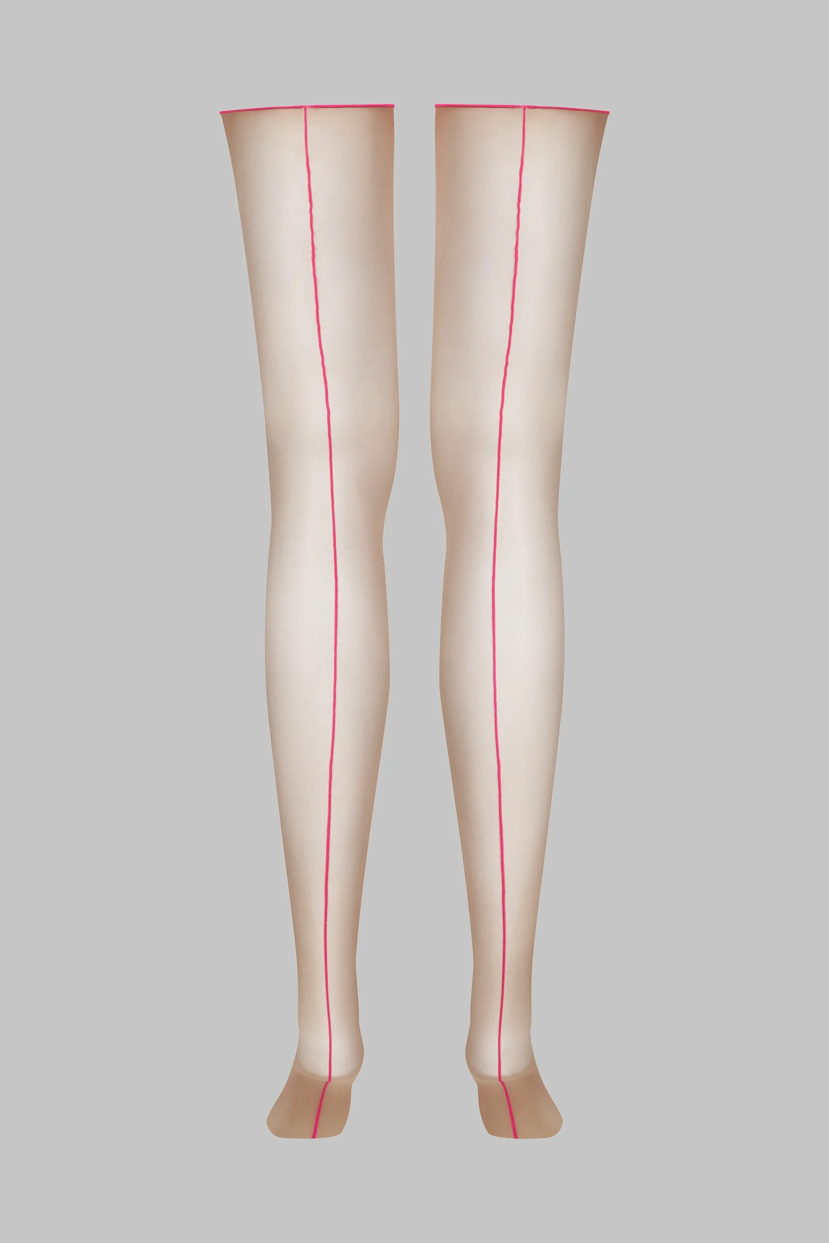 A l’arrière, les bas sont rehaussés d’une couture fluo, une signature flashy qui s’harnache telle une décharge d’insouciance venue des eighties. Son voile 20 deniers en fait un véritable écrin de douceur.