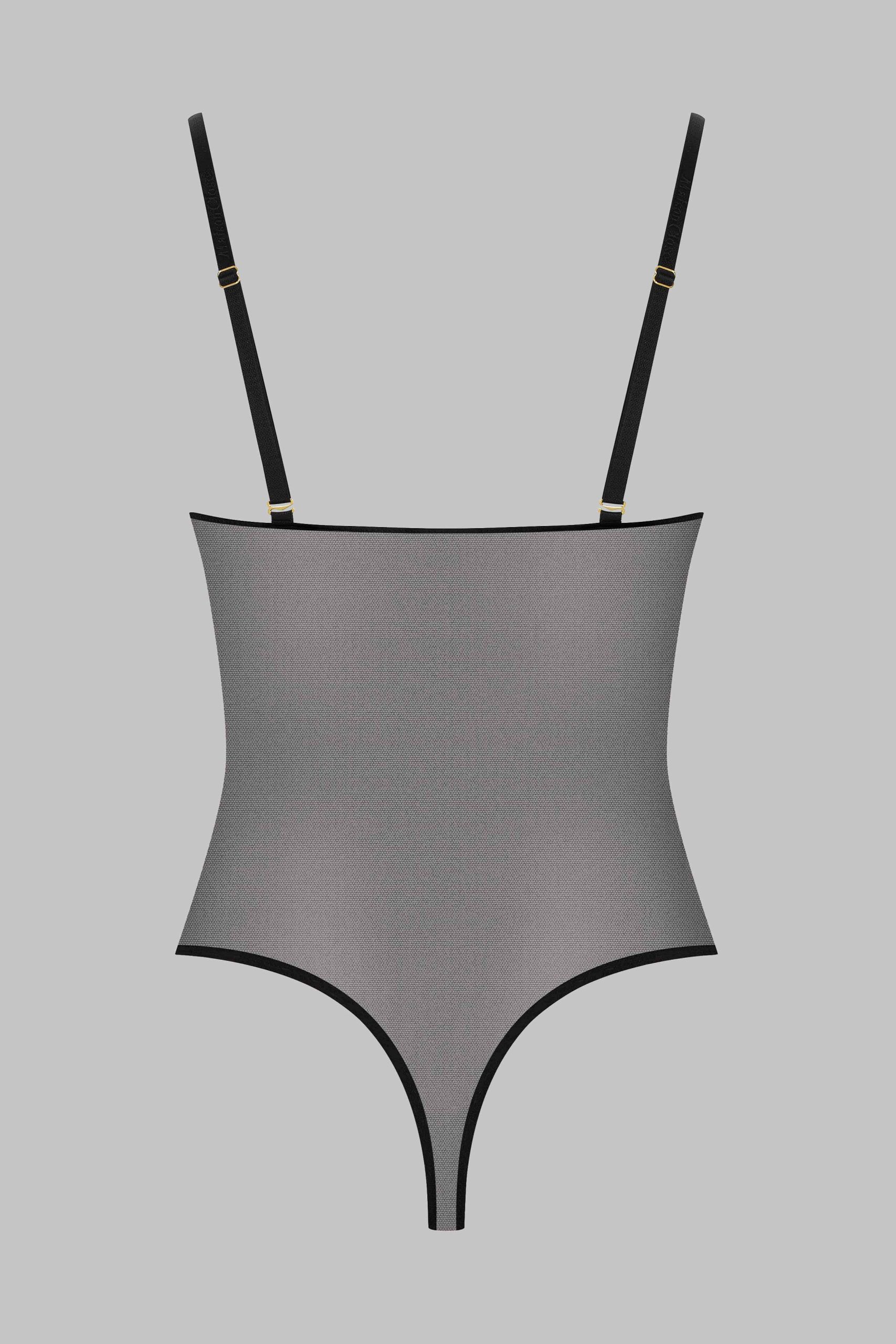 Le body string au coloris noir se pare d’un tulle doux à la transparence irisée.