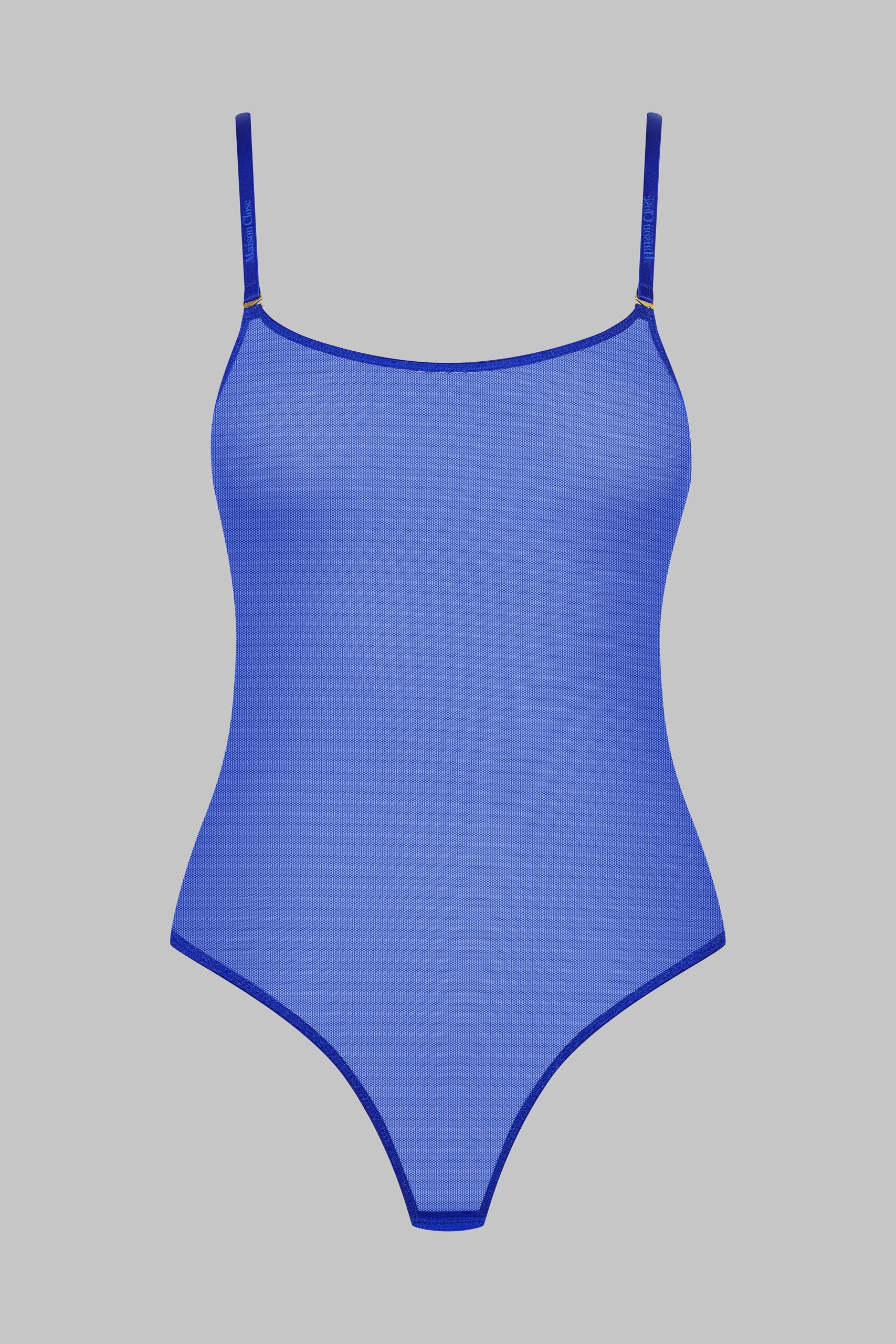 Le body string au coloris néon se pare d’un tulle doux à la transparence irisée.