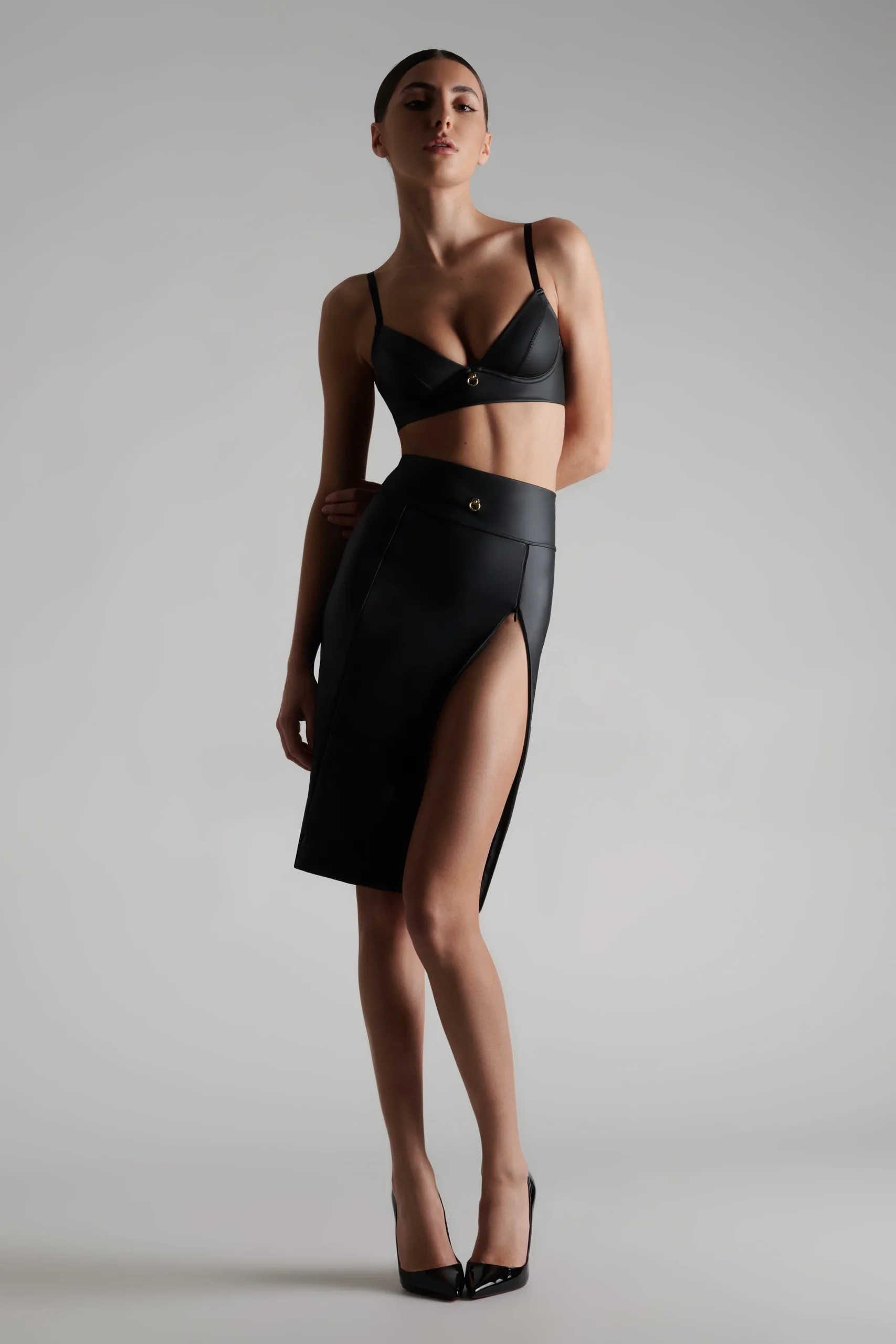 Brassière effet-cuir mat sans armatures. Forme bustier doublée à l’avant pour une finition sans coutures, bonnets avec une coupe triangle. Pièce à enfiler, tour de dos réglable par des élastiques aux accessoires dorés. Bretelles élastiques ajustables au dos. Signature de la collection, un anneau « féti-chic » doré orne le décolleté et suggère l’attachement.