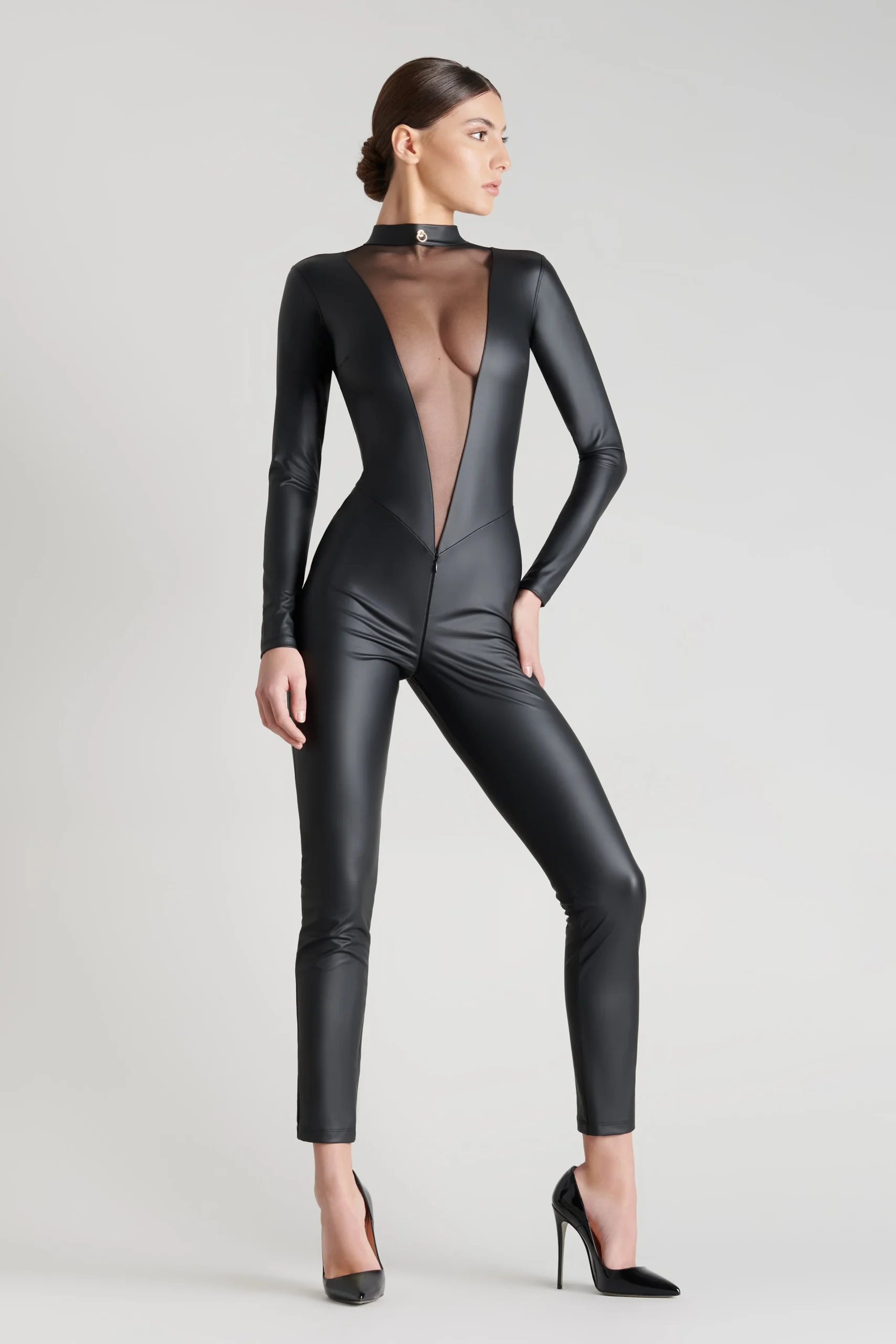Catsuit qui joue un double effet-cuir mat et tulle transparent. Découpes graphiques en tulle V plongeant qui sublime le décolleté et dévoile le dos. Fermeture de l’avant au dos par un zip double sens ton sur ton. Signature de la collection, un anneau « féti-chic » doré orne le col et suggère l’attachement.