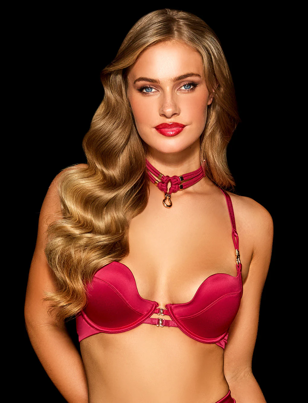 All tied up in red rope lingerie. Inspired by the sensual art of rope bondage and Shibari, Charlize is a luxurious satin style equipped with custom loop hardware, lark’s head knots, and soft red ropes. Made with perfect curves and a flawless cut, the collection includes a multi-way suspender, ouvert thong, open-back brief, and the most wearable contour bra for a lifted, rounded look.