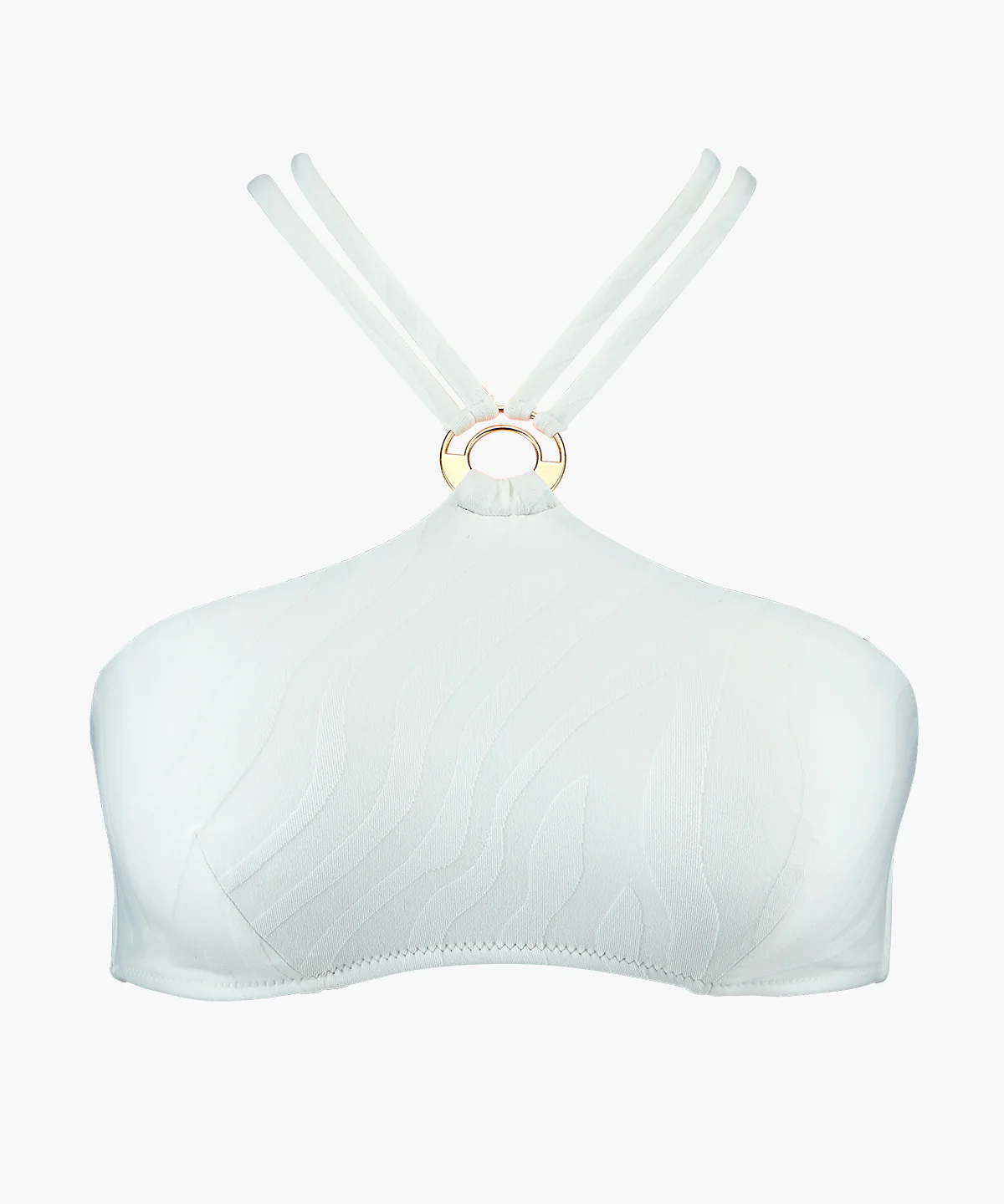 Nouvelle forme complètement inédite et résolument tendance de cette saison, le haut de maillot de bain brassière Coconut Sand offre une coupe souple et légère, mettant en valeur la vibrance du coloris blanc chaud exclusif de cette collection, rehaussé par un dessin zébré en relief. Reliées à l’ensemble par un anneau dans un coloris or mat raffiné, les doubles bretelles naissent, dans un jeu de liens sexy, au cœur du décolleté, passent au niveau du cou, structurant le buste, et se croisent dans le dos pour un modèle iconique qui se suffit à lui-même.