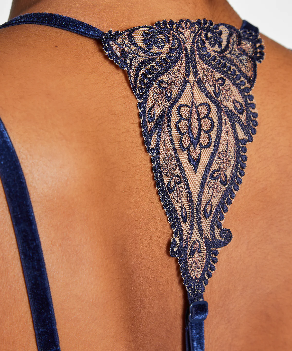 Avec sa broderie brodée bleu profond et champagne rosé habillant tout le décolleté et se prolongeant jusque sur un motif amovible dans le dos, le triangle plunge Cœurs Enlacés assure un maintien optimal, tout en offrant un soutien-gorge plongeant, confortable et sexy qui se laissera volontiers dévoiler avec audace sous une chemise ouverte ou un haut dos nu.