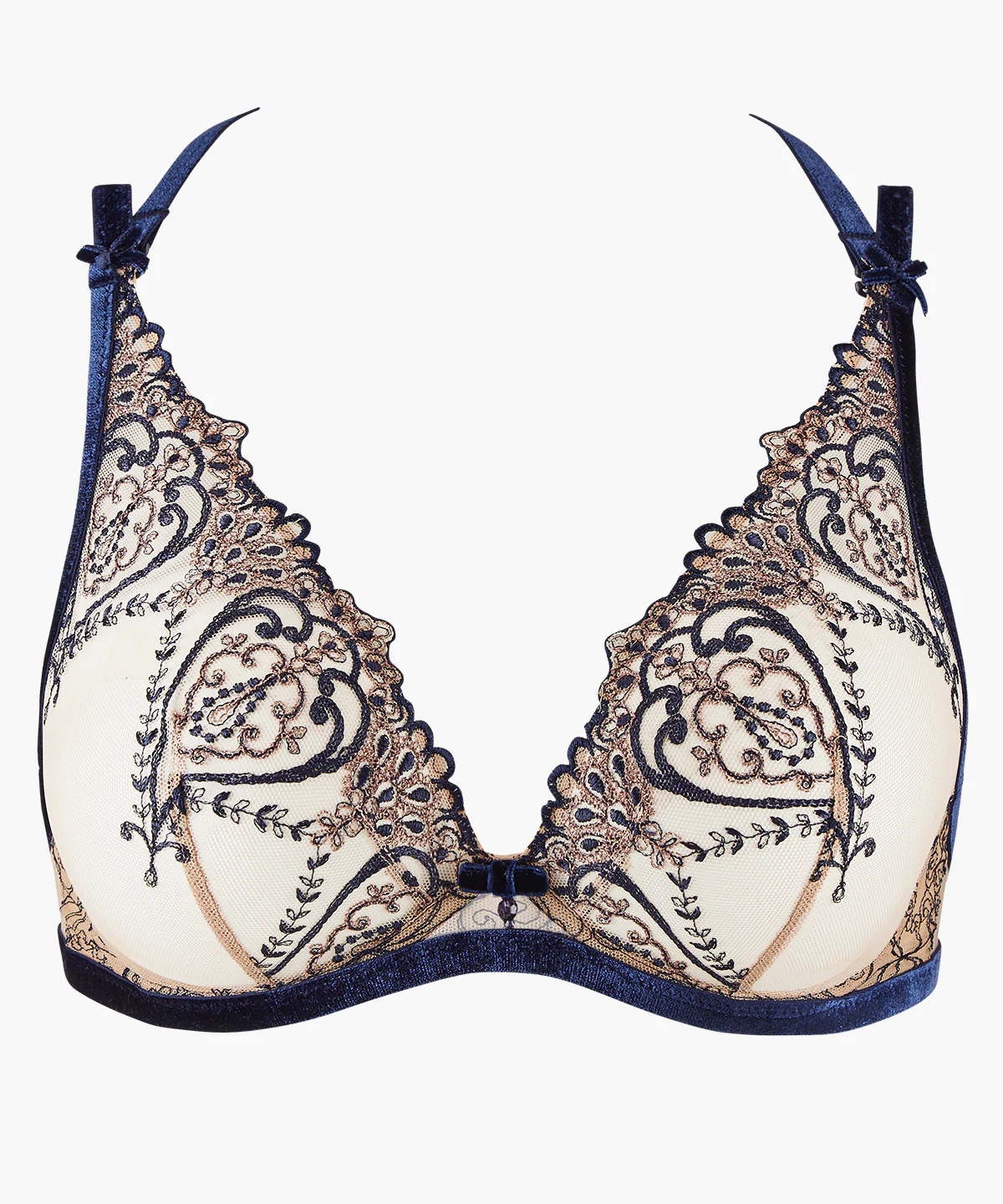 Avec sa broderie brodée bleu profond et champagne rosé habillant tout le décolleté et se prolongeant jusque sur un motif amovible dans le dos, le triangle plunge Cœurs Enlacés assure un maintien optimal, tout en offrant un soutien-gorge plongeant, confortable et sexy qui se laissera volontiers dévoiler avec audace sous une chemise ouverte ou un haut dos nu.
