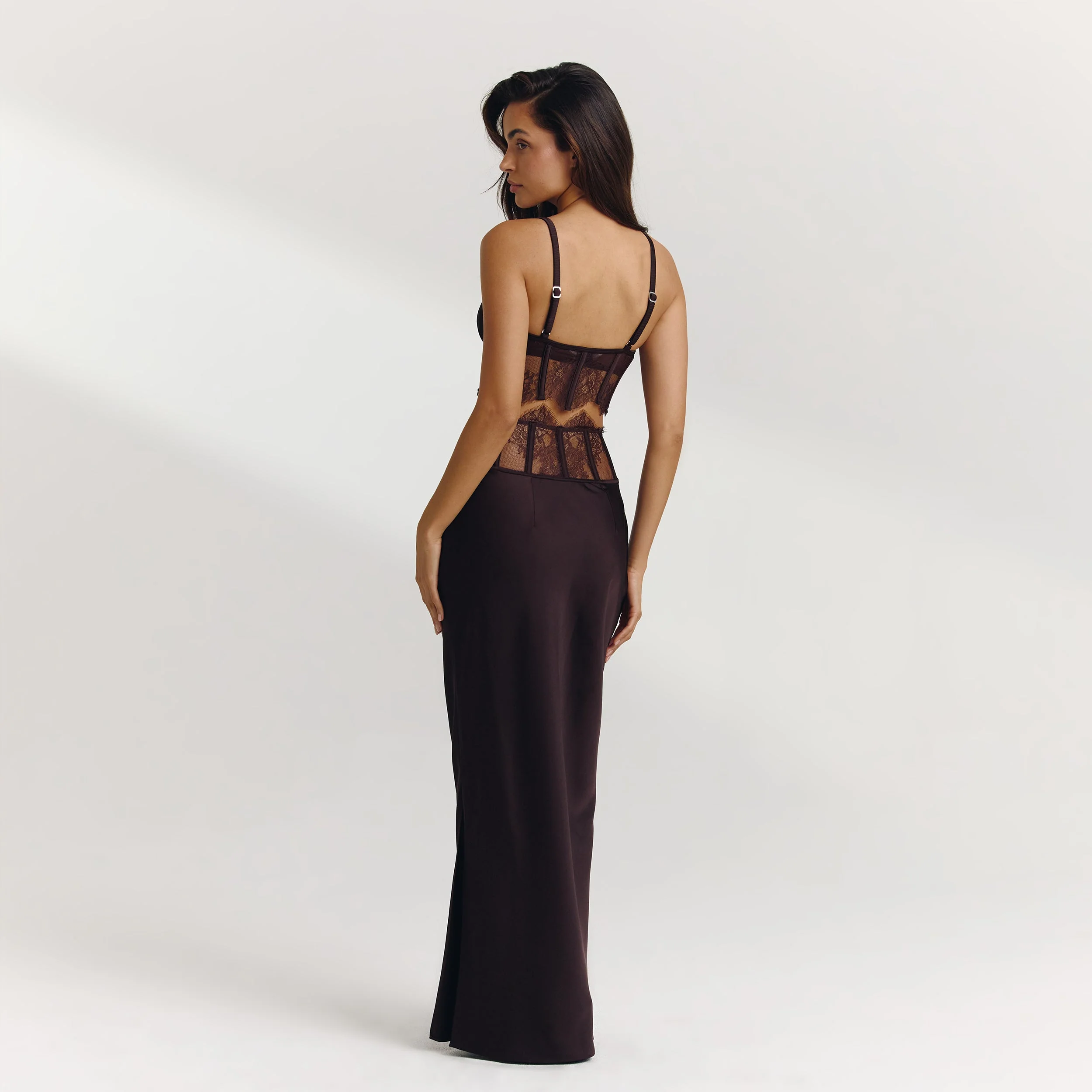 - Dentelle délicate en V pour créer une silhouette sablier