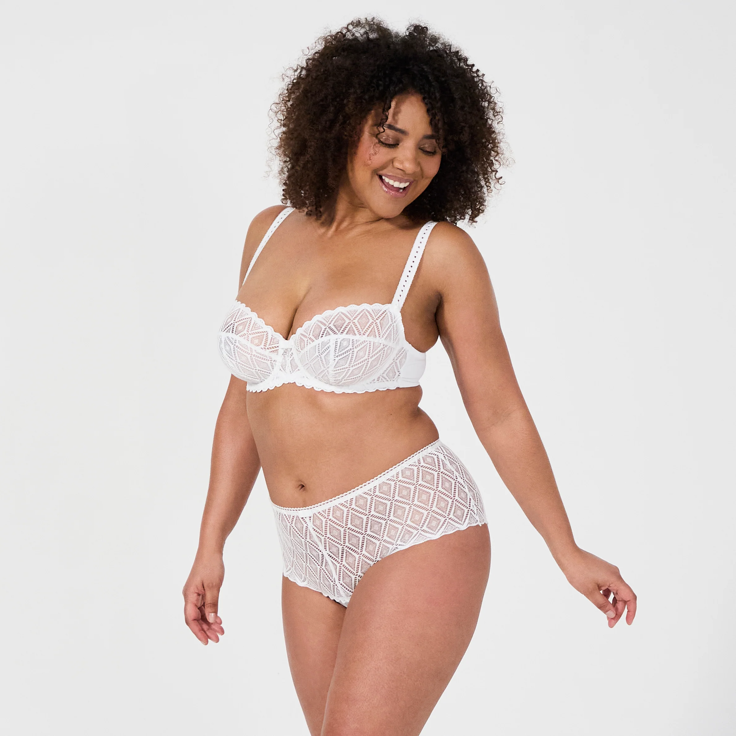 • Dentelle mate dessin géométrique toucher doux• Devant et dos en dentelle• Fond de culotte extérieure en maille microfibre• Elastique fantaisie avec picot à la taille