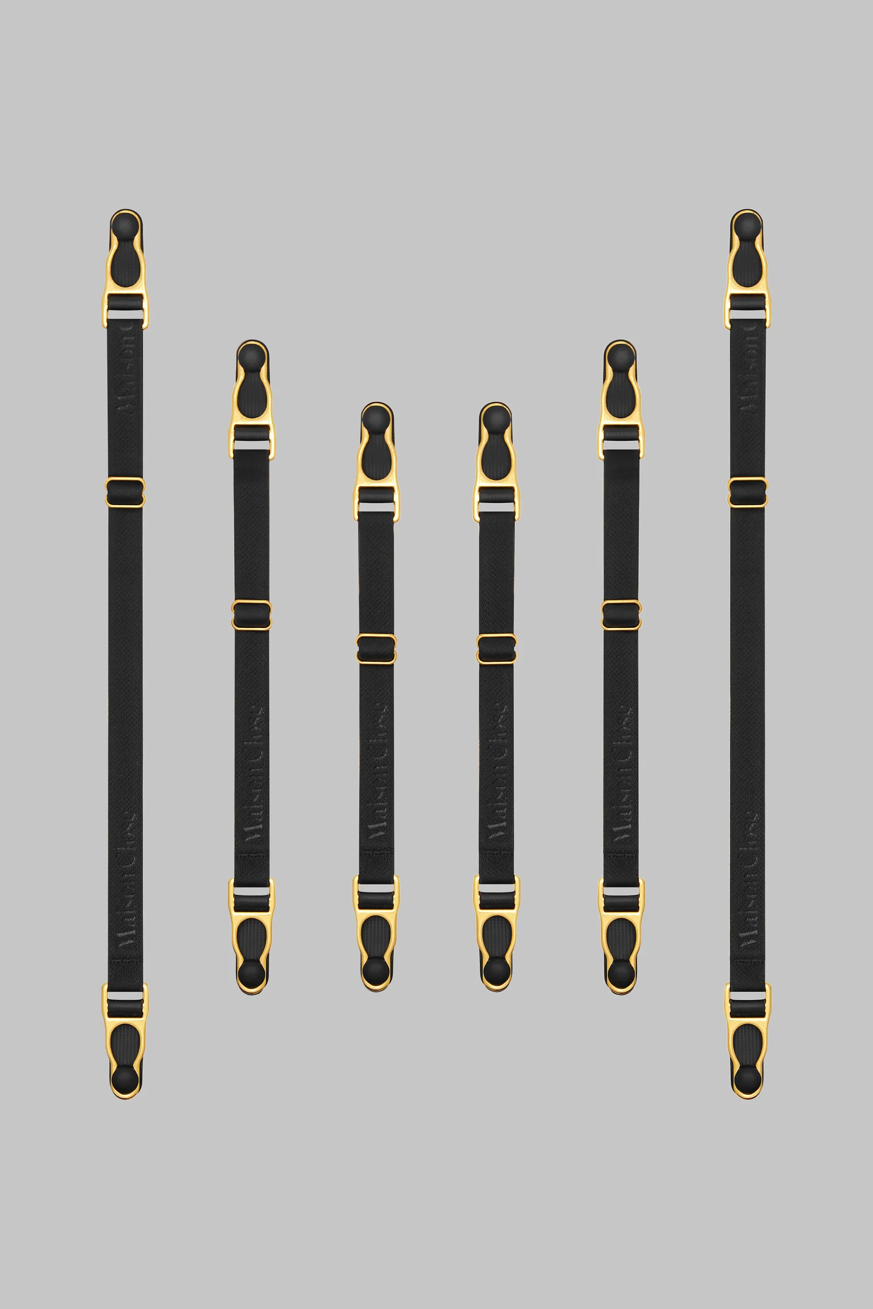 Six double-jarretelles Signature noires amovibles et réglables aux finitions dorées. Les attaches double sens permettent d’accessoiriser vos bas avec toute votre lingerie et votre prêt-à-porter Maison Close sans avoir besoin de porte-jarretelles. À jouer selon vos envies, l’occasion pour chaque Muse de créer son mix and match.