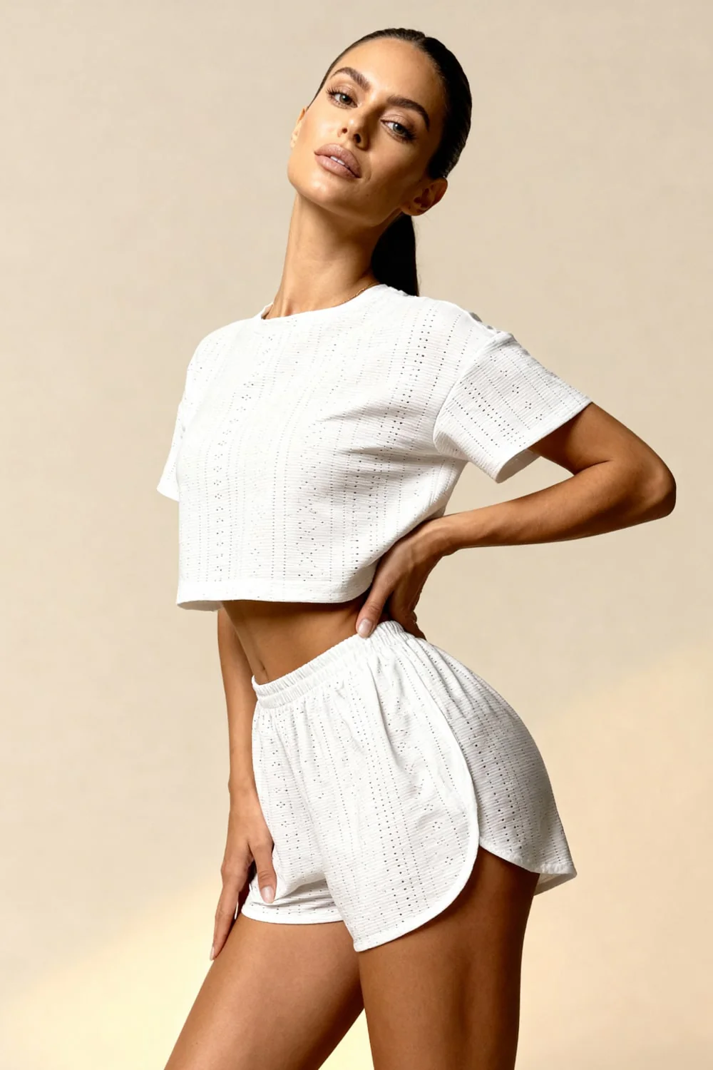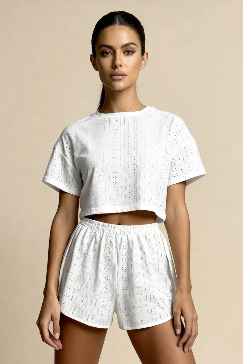 Le short assorti à taille élastique offre confort et liberté de mouvement, orné du même travail de broderie anglaise qui crée un jeu de légèreté. La coupe décontractée du top s’arrête juste au-dessus de la taille, parfaite pour les journées ensoleillées.
