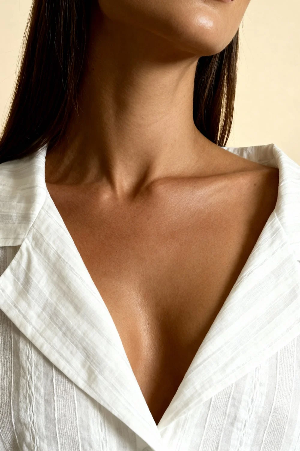 L’ensemble Marguerite en gaze de coton blanc cassé incarne l’élégance bohème avec une touche romantique. Cet ensemble deux pièces raffiné se compose d’une veste de pyjama boutonnée et d’un pantalon assorti, tous deux confectionnés dans une gaze de coton légère et texturée. La veste présente un col tailleur classique, une fermeture boutonnée sur le devant et des manches à volants délicats qui ajoutent une note féminine. Le pantalon taille élastique offre une coupe fluide et confortable avec des jambes larges ornées de volants en bas pour un effet bohème chic. La matière en gaze de coton texturée apporte une dimension artisanale et sophistiquée à l’ensemble, tandis que la ceinture à nouer à la taille permet d’ajuster la silhouette. Un pyjama élégant qui se porte aussi bien pour dormir que pour se détendre avec style.