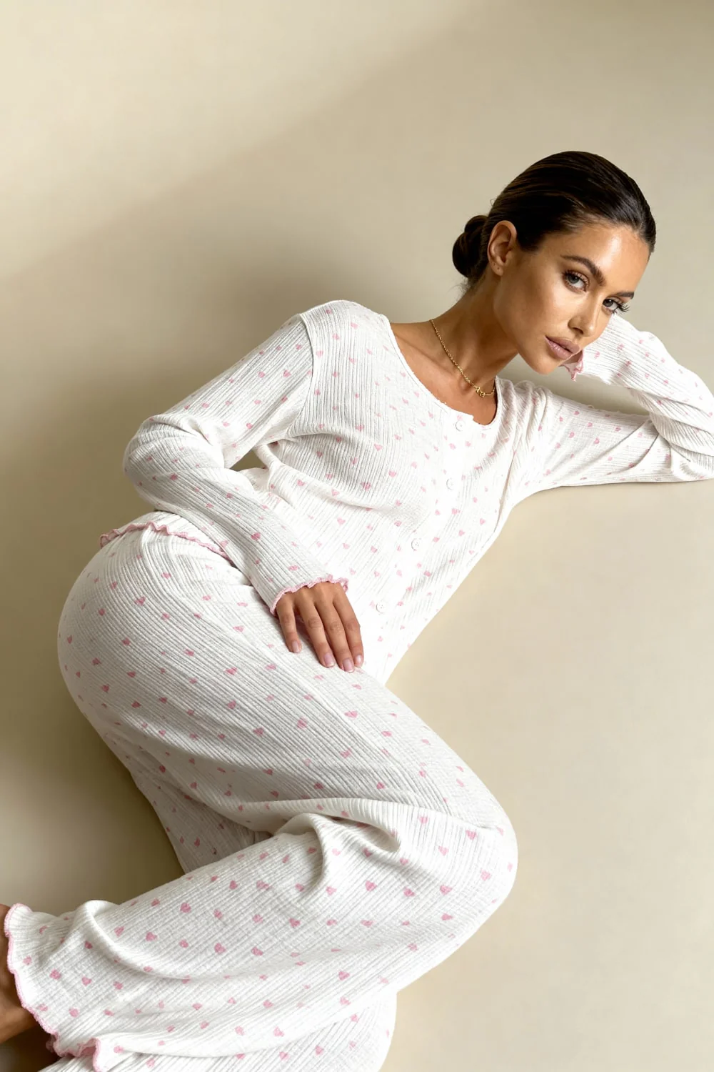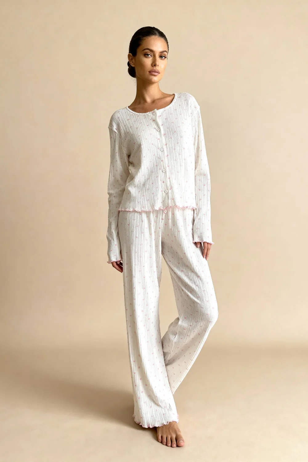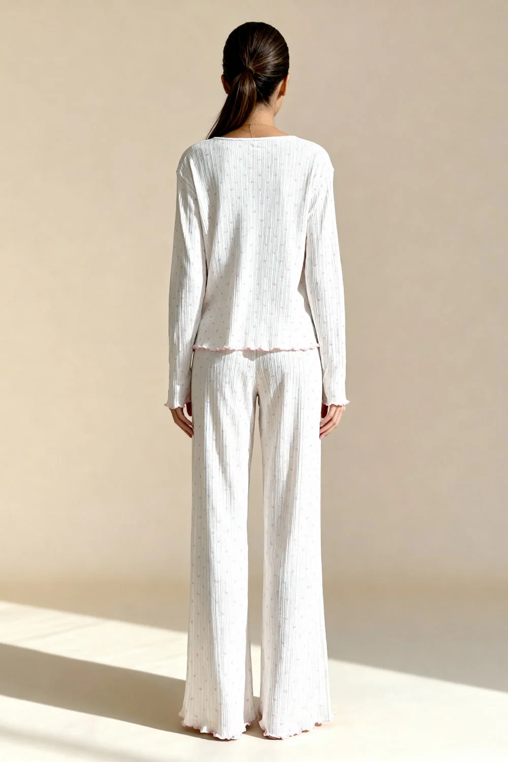 L’ensemble Neraya en jersey côtelé blanc cassé à cœurs roses incarne la douceur romantique avec une touche ludique. Cet ensemble deux pièces charmant se compose d’une veste boutonnée et d’un pantalon assorti, tous deux confectionnés dans un jersey côtelé doux orné d’un imprimé de petits cœurs roses délicats. La veste présente un col rond avec finitions festonnées roses, une fermeture boutonnée sur le devant et des manches longues avec poignets festonnés assortis. Le bas de la veste arbore également une bordure festonnée rose qui ajoute une touche féminine. Le pantalon taille élastique offre une coupe évasée confortable avec des jambes larges ornées de volants festonnés en bas. Un pyjama adorable qui allie confort et style romantique pour vos nuits douces.