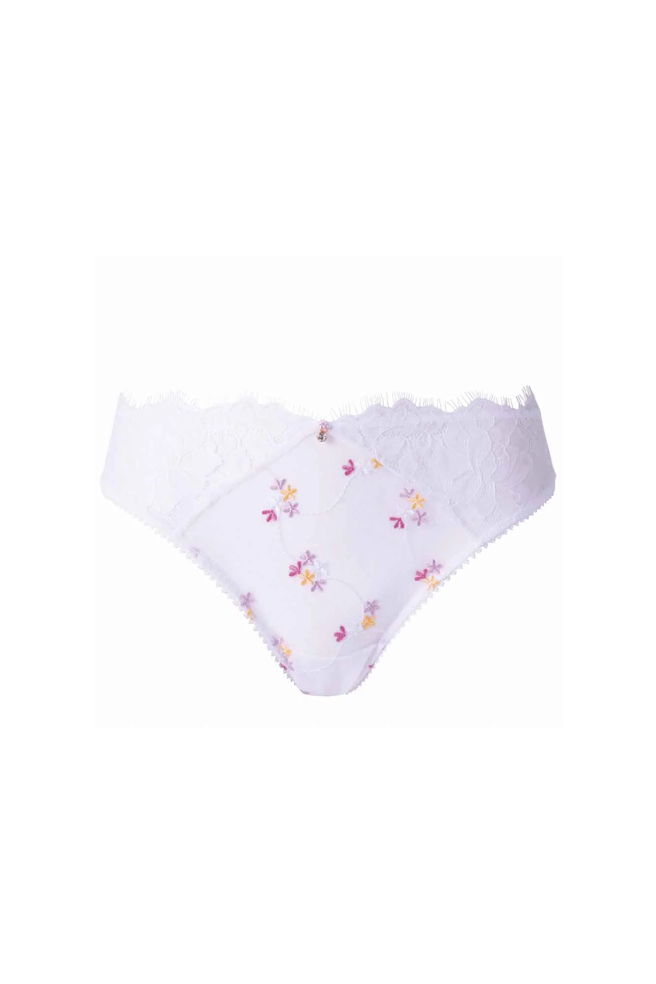 Confectionné avec soin, ce slip en tulle délicatement brodé au motif de « petites fleurs », associé à une dentelle à l’effet de cil, évoque l’élégance et la féminité emblématiques de l’ère vintage. Le bijou strass mordoré à la ceinture élastiquée ajoute une touche de glamour subtile, tandis que le dos en tulle plumetis offre une finition raffinée.