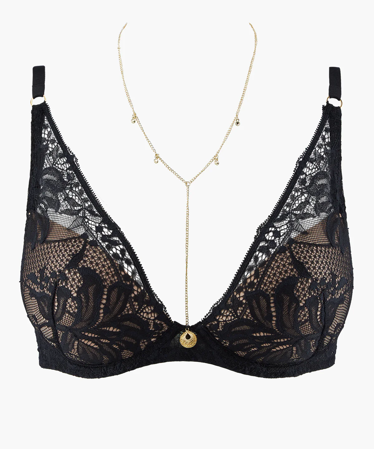 Avec sa dentelle remontant haut sur la poitrine, le soutien-gorge plunge foulard Gold Pleasure en souligne le galbe et confère au décolleté un effet push-up très sexy, sublimé par une chaînette façon sautoir. Derrière, les doubles bretelles offrent maintien et confort, tout en apportant un style résolument moderne à l’ensemble.