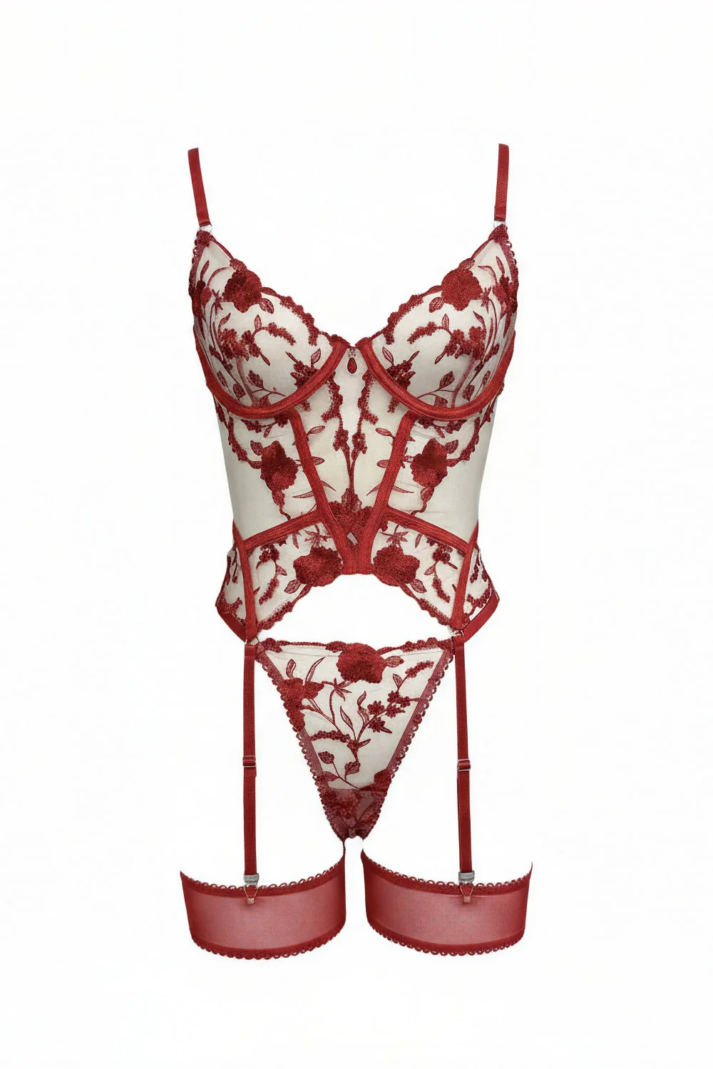 La guêpière Marisela Rouge célèbre l’art de la séduction avec sa dentelle florale bordeaux sur tulle nude et ses détails raffinés. Le bustier à armatures structure la silhouette avec élégance, tandis que les découpes audacieuses et les empiècements transparents créent un jeu de transparence captivant. Les bretelles ajustables et les jarretelles intégrées complètent cette pièce sophistiquée, conçue pour sublimer chaque courbe. Livrée avec un string assorti en dentelle, cette guêpière rouge incarne le luxe et la sensualité absolue pour des moments d’exception.