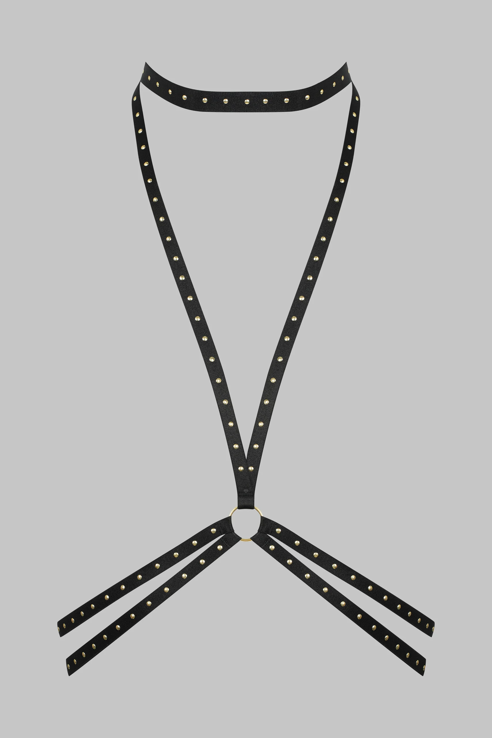 Le harnais PARURE CLOUS noir souligne les lignes du buste avec précision. Serti de clous dorés, il se compose de bandes élastiques ajustables qui épousent la silhouette avec souplesse. Pensé pour être porté seul ou assorti à la culotte ouverte et aux jarretières, il permet de créer l’illusion.