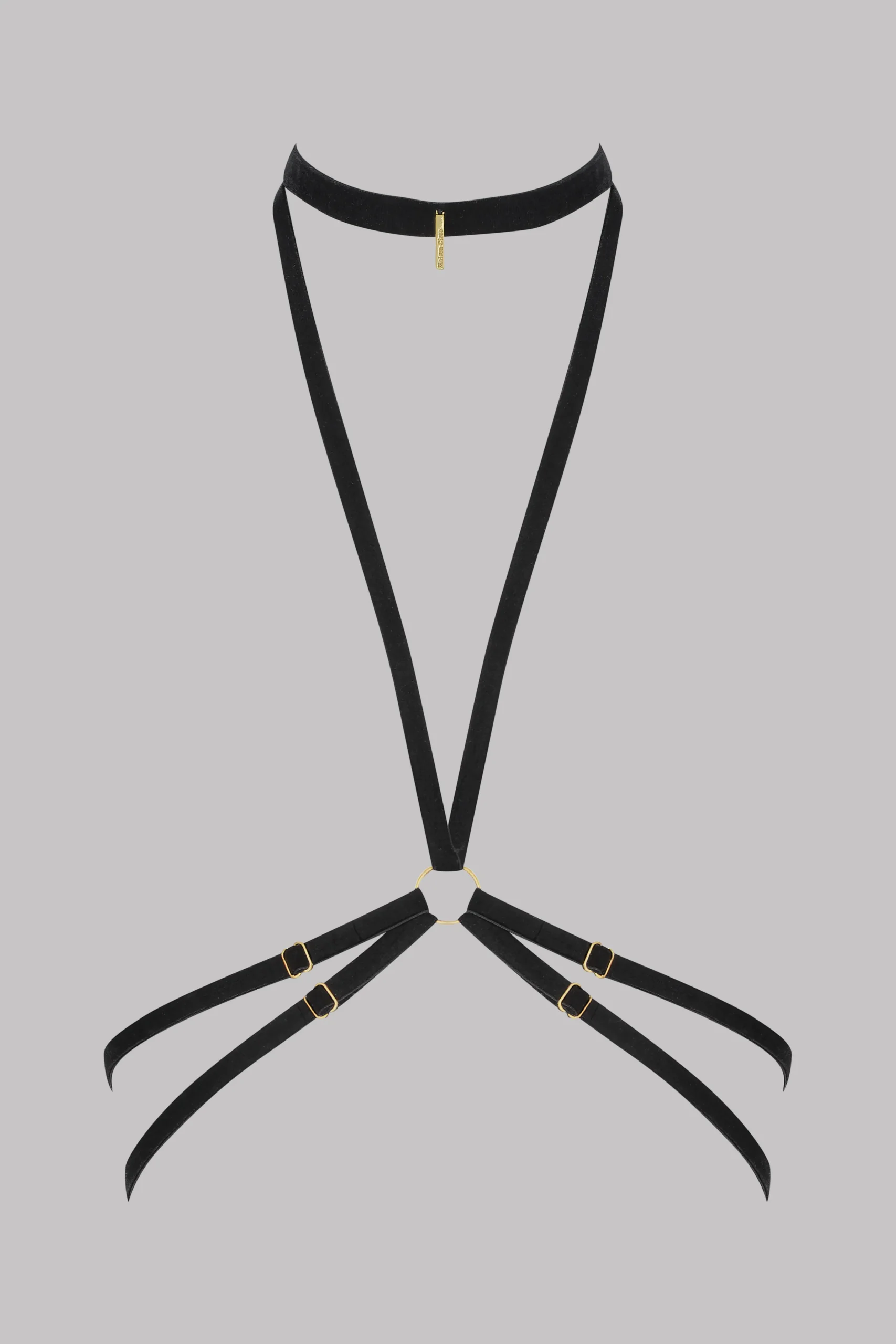 Le harnais PARURE VELOURS noir souligne les lignes du buste avec précision. Réalisé en velours doux au toucher, il se compose de bandes ajustables qui épousent la silhouette avec souplesse. Une pampille dorée gravée Maison Close signe cette pièce. Pensé pour être porté seul ou attaché à la culotte ouverte assortie, il permet de créer l’illusion d’un body. Un accessoire de lingerie modulable, livré dans son pochon en velours noir.