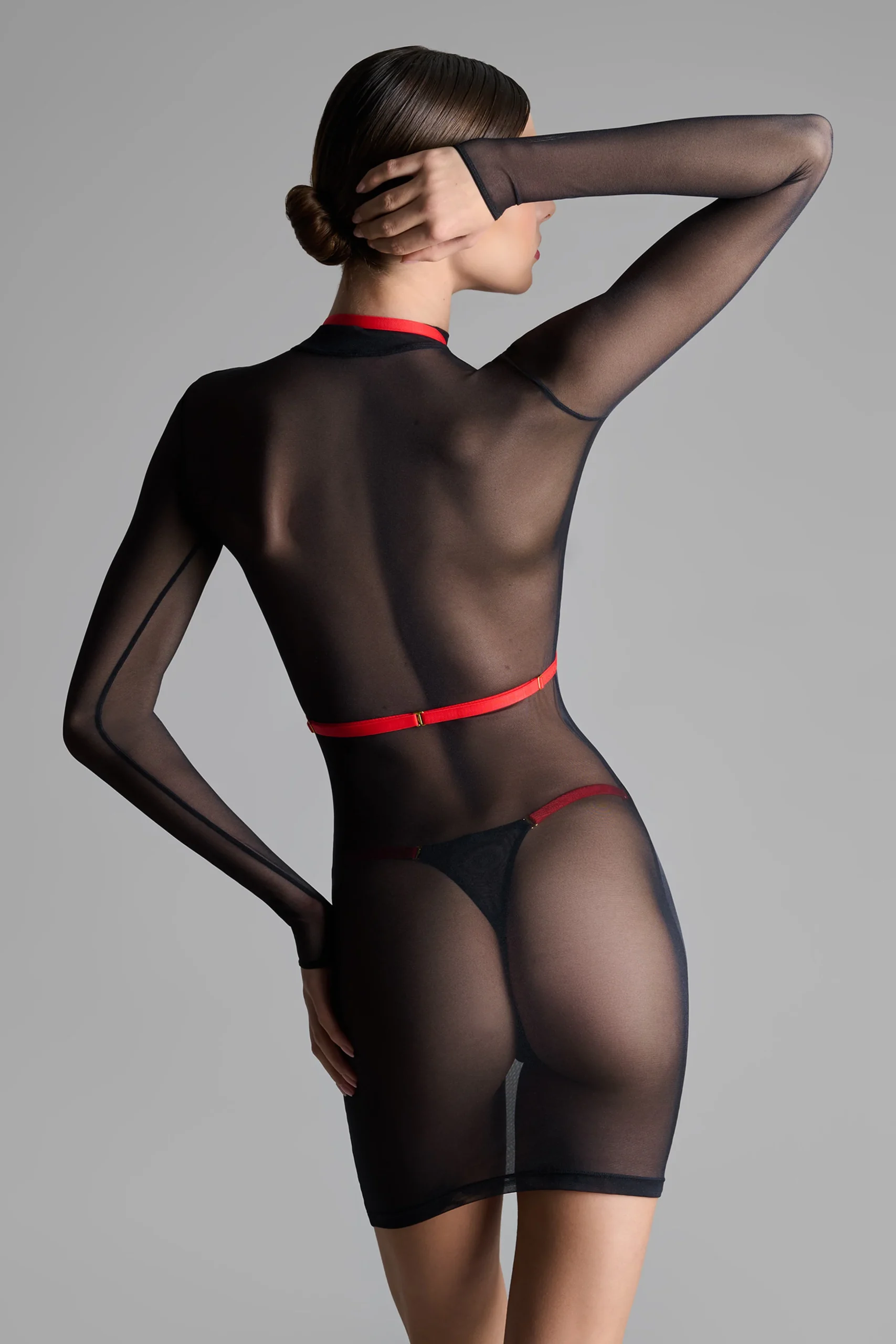 Harnais Signature rouge estampé Maison Close. Élastiques reliés par un anneau, aux finitions dorées réglables. A porter au décolleté ou dans le dos selon vos envies. Ouvrable par une accroche au dos.