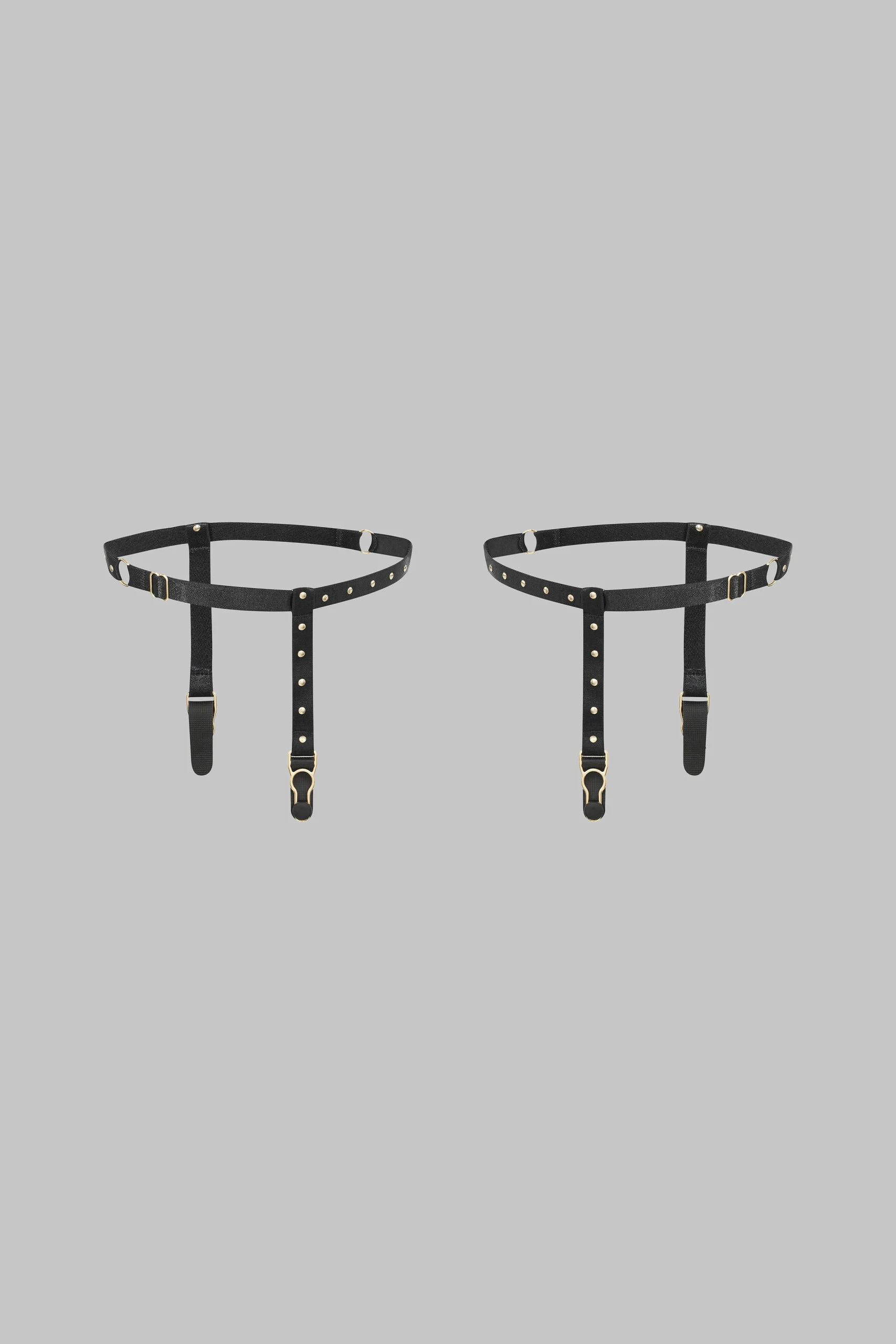 Les jarretières PARURE CLOUS noir soulignent les jambes avec élégance. Serties de clous dorés, elles se composent de bandes élastiques entièrement ajustables pour s’adapter à toutes les morphologies. Dotées de jarretelles dorées, elles permettent d’associer élégamment une paire de bas. À porter seules ou coordonnées avec la culotte et le harnais de la ligne. Un accessoire de liaison entre le corps et le détail.