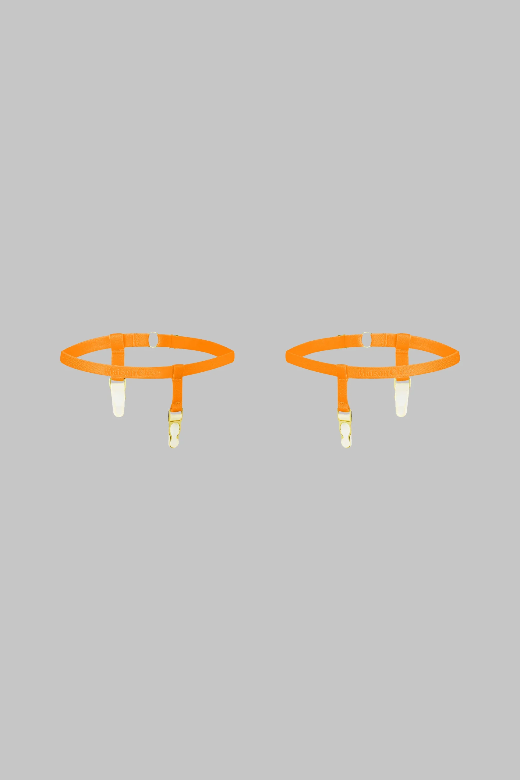 Deux jarretières Signature néon estampées Maison close. Élastiques réglables aux finitions dorées. Mini-jarretelles mobiles à positionner de part et d’autre de la jambe une fois la jarretière ajustée.