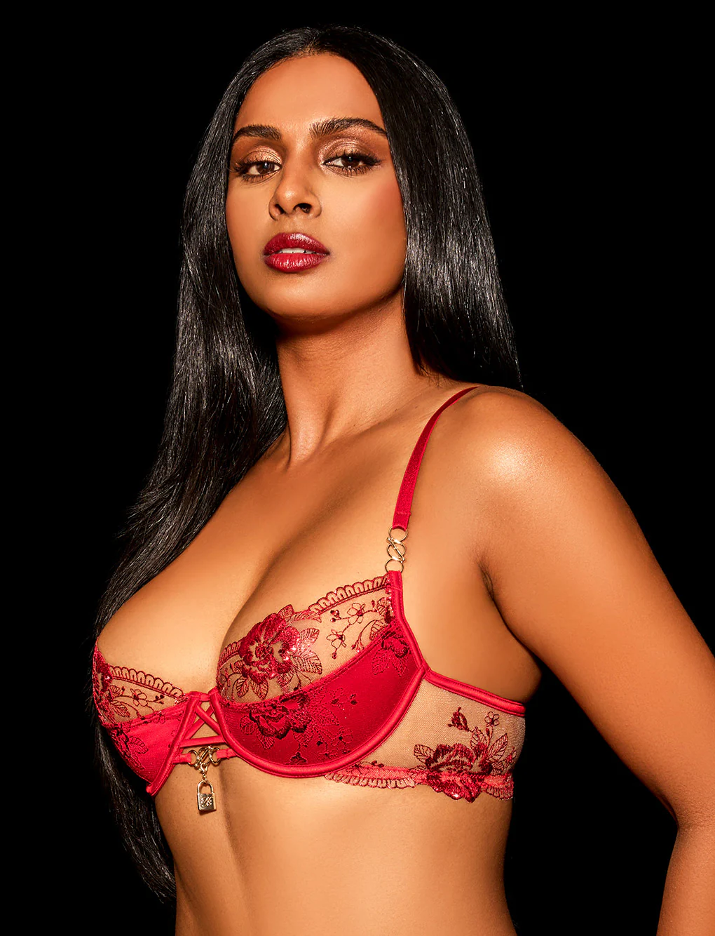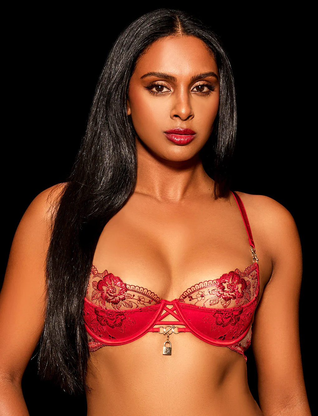 The best of red lingerie is right here, honey. Our iconic Jules collection is back in racy red! Inspired by intricate lacework and exquisite French florals, Jules is a mix of satin with Swiss-designed embroidery and shiny red foil. Finished with sexy strapping and barbell rings, each piece has removable padlock charms that are yours to wear and keep.