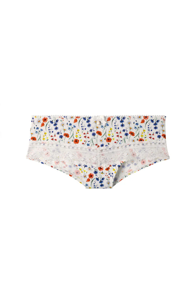 Shorty en microfibre imprimée, motif herbier printanier et coquelicot