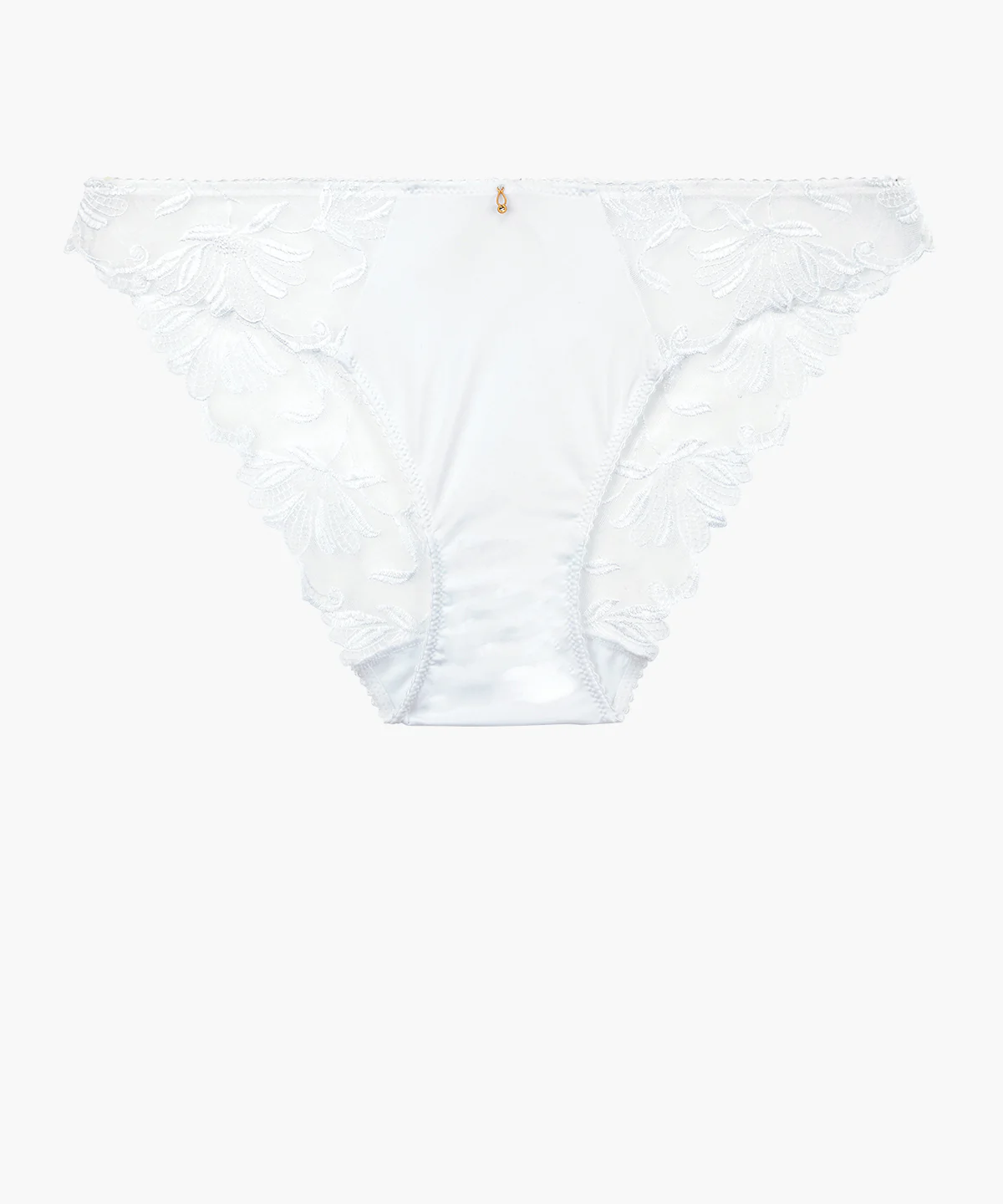 Aussi raffinée et sensuelle devant que dans le dos, la culotte italienne Lovessence pare les hanches et les fesses de motifs floraux brodés exclusifs sur un tulle frais et léger qui encadre une maille douce en Lycra® recyclé pour une sensation de confort absolu tout au long de la journée. Résolument séduisante, elle se pare devant d’un bijou doré faisant ressortir le blanc immaculé du modèle et derrière, d’une découpe en forme de goutte d’eau surmontée par un petit nœud.