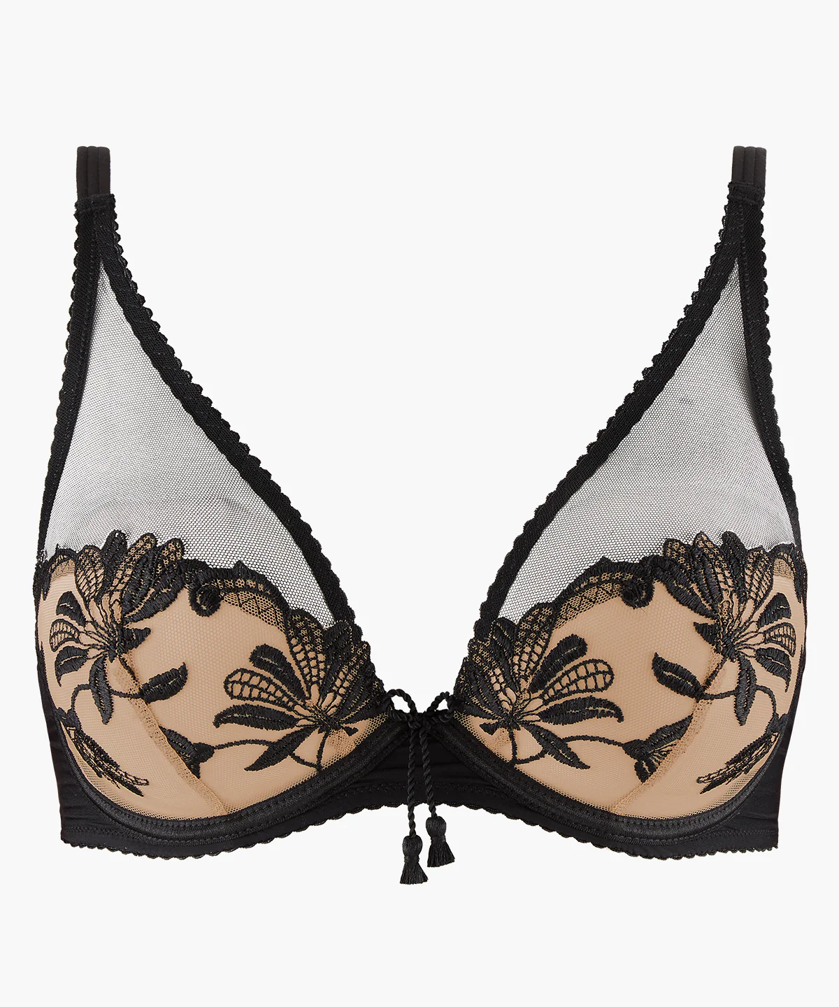 Jouant avec des effets de dévoilement, entre maille douce et confortable, transparente sur le devant et opaque dans le dos, et broderie florale exclusive, toutes deux recyclées, le soutien-gorge triangle armatures Lovessence offre une forme couvrante sur la poitrine pour un décolleté profond et sexy, rehaussé d’un nœud pompon élégant à l’entregorge.