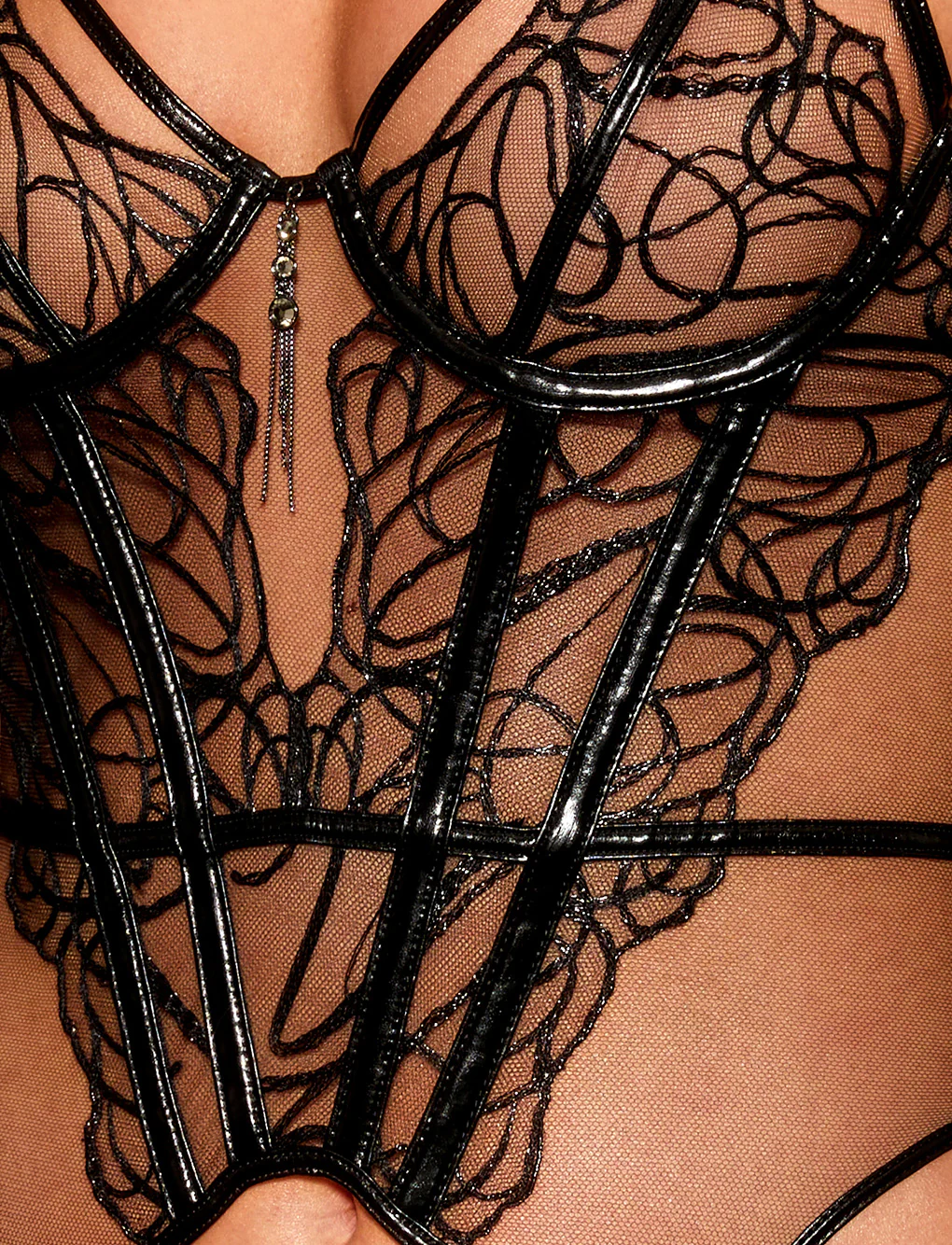Lingerie is art and Lydia is the masterpiece. Inspired by the optical effects of a rippling oil slick, Lydia features Swiss-designed embroidery that skims across the body with free-flowing lines. Adding slate grey hardware, crystals, and tassels, each piece is defined with wet-look leatherette binds. Want a honey hint for some next-level foreplay? Trace the lines of Lydia with the tip of a vibrator.