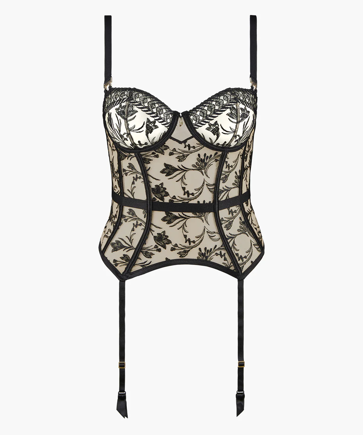 Tout en jeux de transparence, la guêpière Magnetic Spell déploie sa broderie florale délicate dans un effet bustier très sexy. Soulignant la taille, soutenant la poitrine et intégrant des jarretelles, elle offre une pièce complète et raffinée, rehaussée de détails dorés précieux et d’une ouverture résolument séduisante dans le dos.