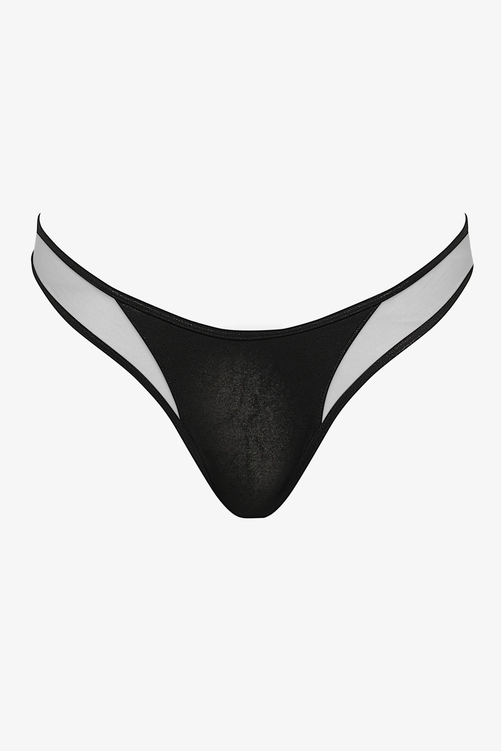 Le maillot string échancré Minuit mise sur un contraste raffiné. Conçu dans un noir profond, ce maillot marie subtilement microfibre opaque et tulle transparent, tous deux rehaussés d’un film métallique noir argenté qui capte la lumière. Échancrure accentuée par une découpe graphique et un jeu de transparence. Maillot doublé à l’entrejambe et doté d’élastiques fins et souples.