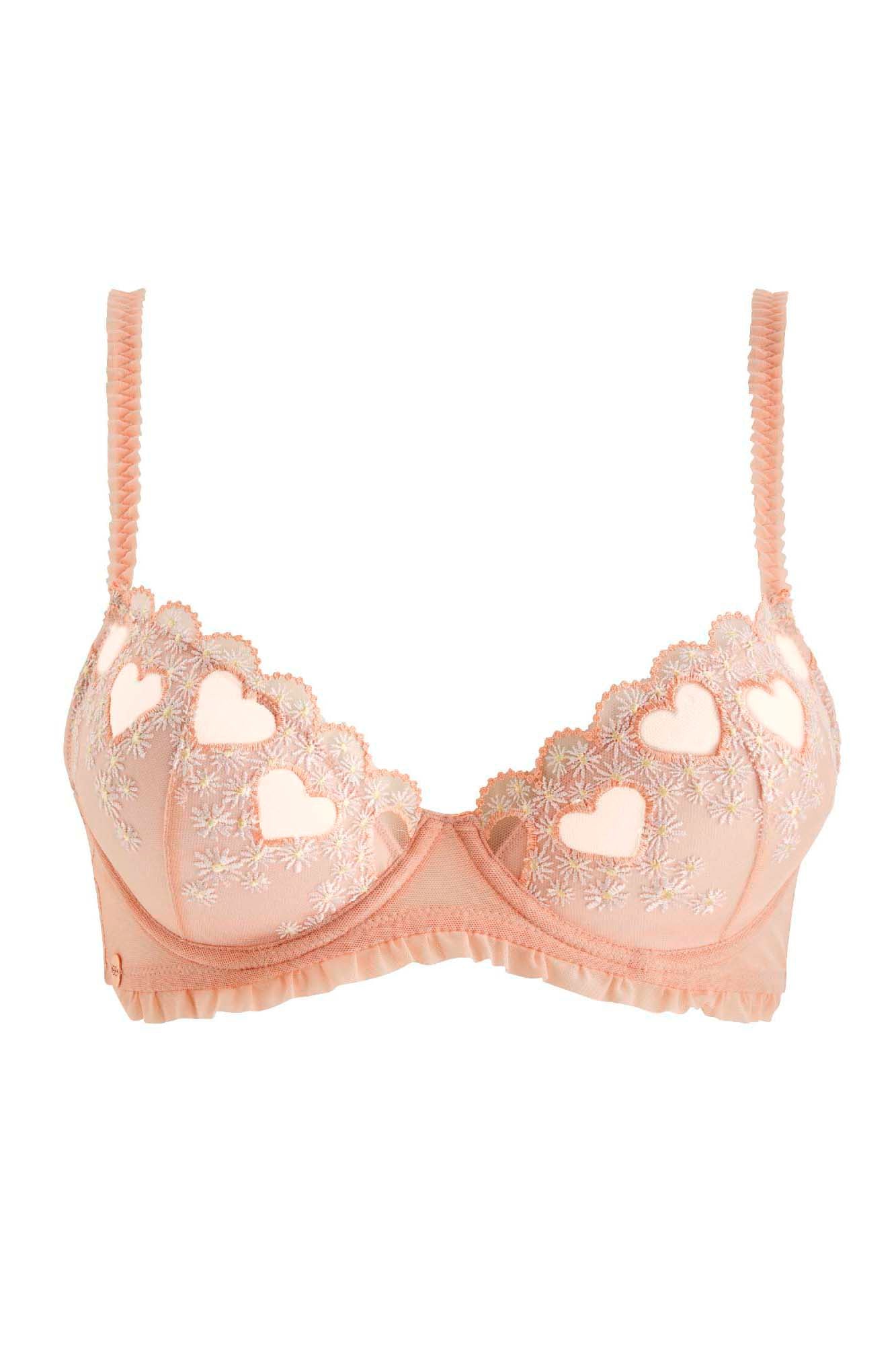 DESCRIPTIONSoutien-gorge coquesDécolleté classiqueTout en tulle brodé motif cœur et petites margueritesBretelles froufrous fines et réglablesFermeture dos 2 agrafes, 3 positionsDisponible du 85B au 95C COMPOSITIONTulle : 100% POLYAMIDEFil de broderie : 100% POLYESTERMatière ajourée : 95% POLYAMIDE 5% ELASTHANNEDoublure bonnet : 100% POLYESTER