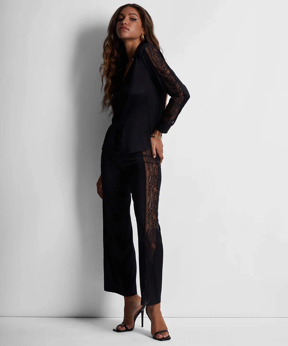 Conçu pour être porté de jour comme de nuit, le chemisier Midnight Whisper se prête à toutes les occasions. Entièrement en soie brillante et sensuelle, il se pare d’un élégant boutonnage rehaussé par un bouton doré sur le col. Sur les manches, des empiècements en dentelle sexy dévoilent la peau.