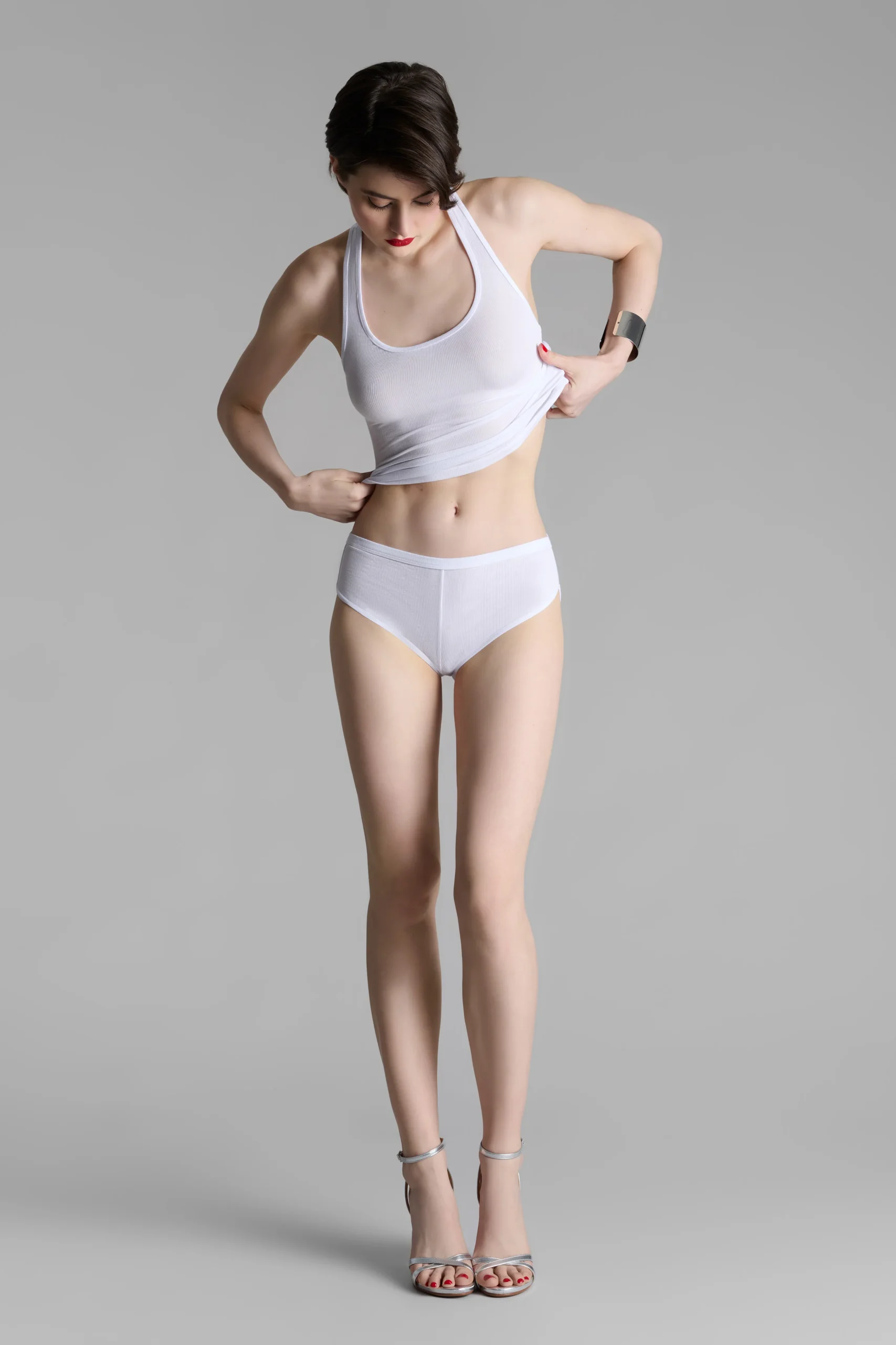Mini short taille basse au toucher unique. Modal côtelé extensible, ultra doux et léger qui s’étire en brillance comme en transparence. Ceinture élastique recouverte à la taille. Coupe 80s fentes arrondies sur les côtés pour sublimer la silhouette.