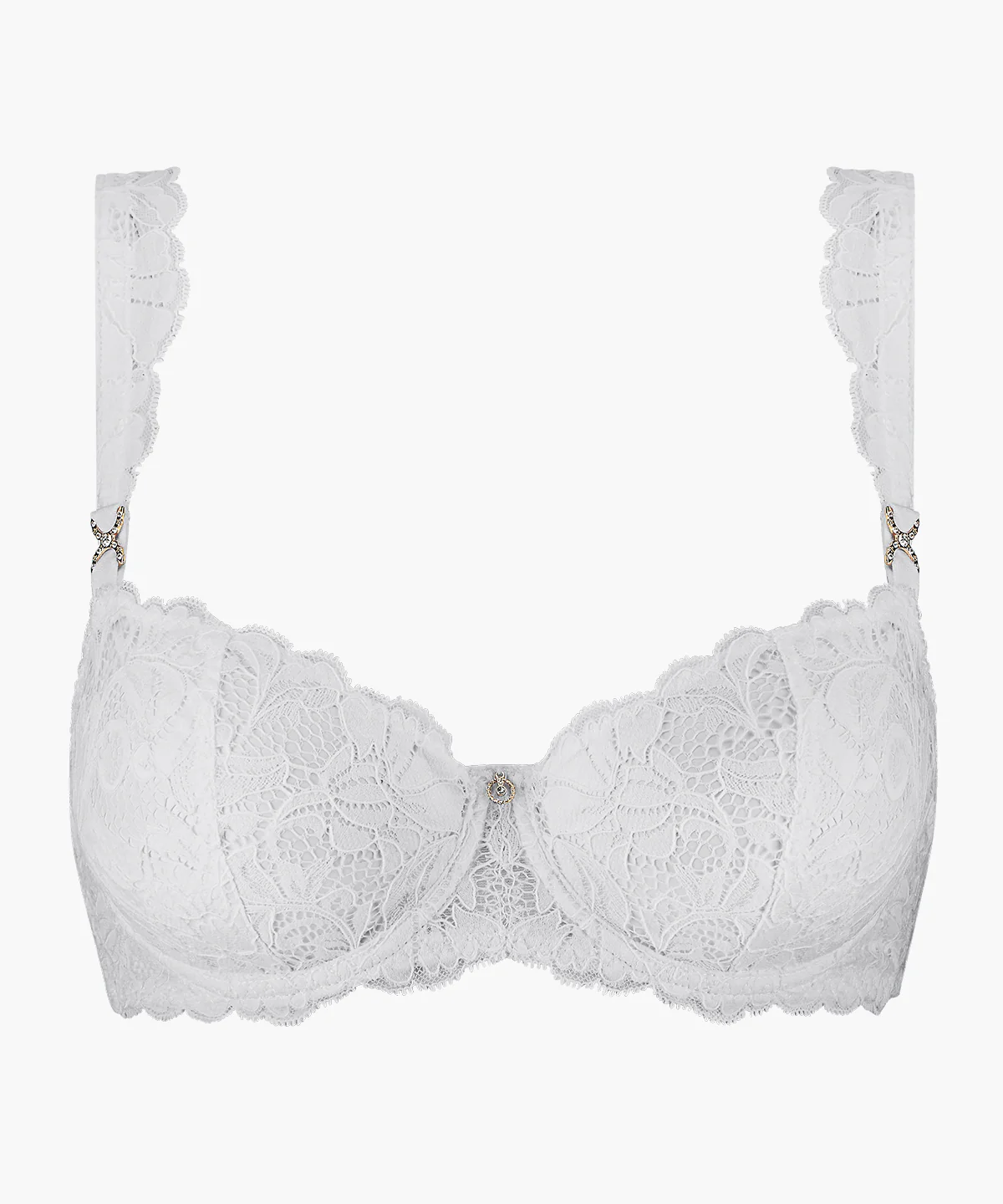 Forme sexy emblématique de la marque, le soutien-gorge corbeille armatures Mon Bijou, disponible jusqu’au bonnet G, se réinvente cette saison dans un coloris blanc intemporel. Créant un effet push-up naturel joliment projeté, il galbe les seins et rehausse la poitrine de sa dentelle finement ciselée qui se poursuit jusque sur les bretelles, sublimant les épaules. Confortable et moderne, il offre un décolleté ouvert et séduisant, encadré par des détails dorés et strass, dans un modèle sophistiqué fait pour être laissé apparent sous un top à bretelles ou une chemise largement ouverte.