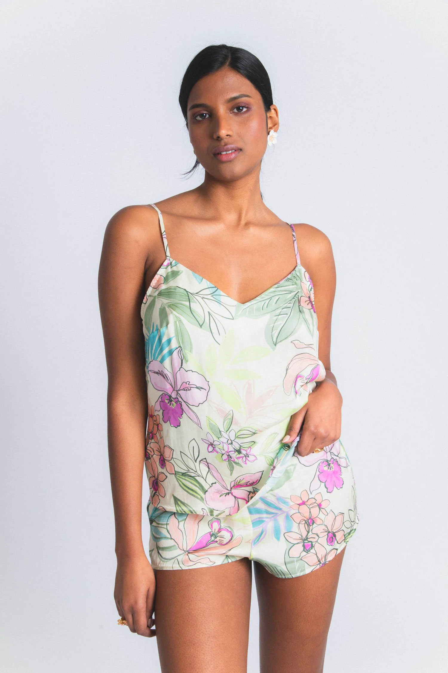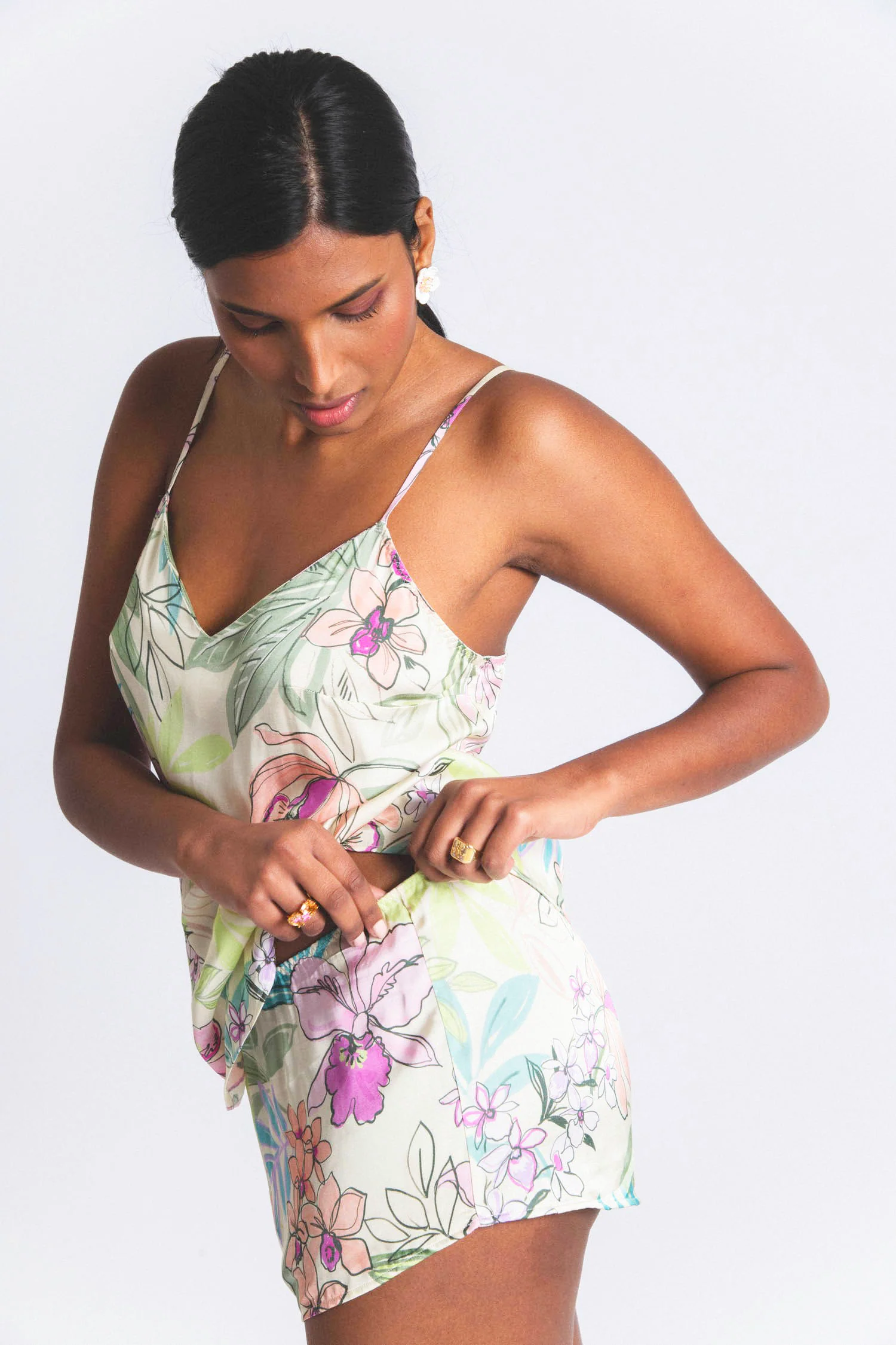 Un short imprimé sur fond jaune pâle, chic et confortable, à porter de jour comme de nuit.