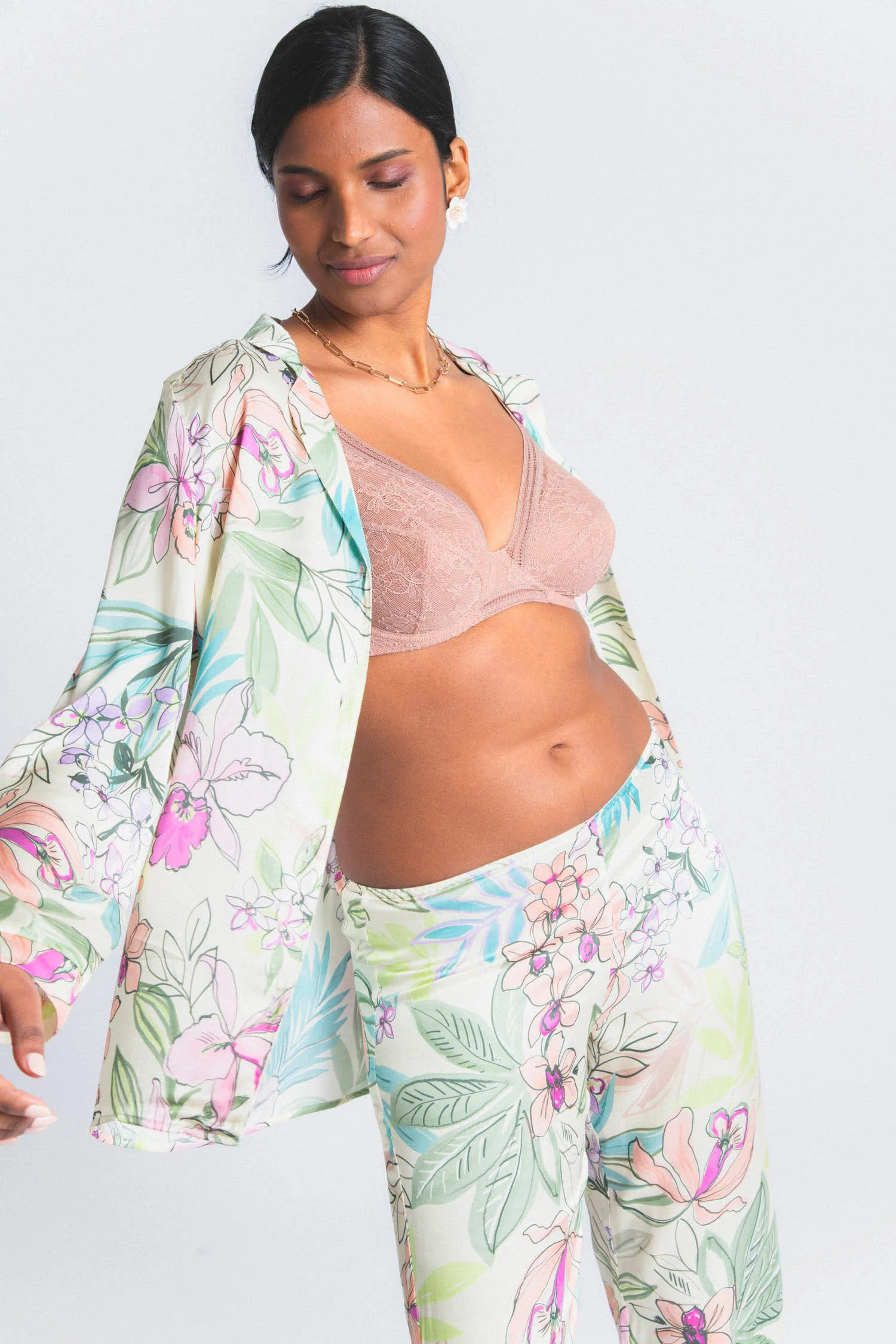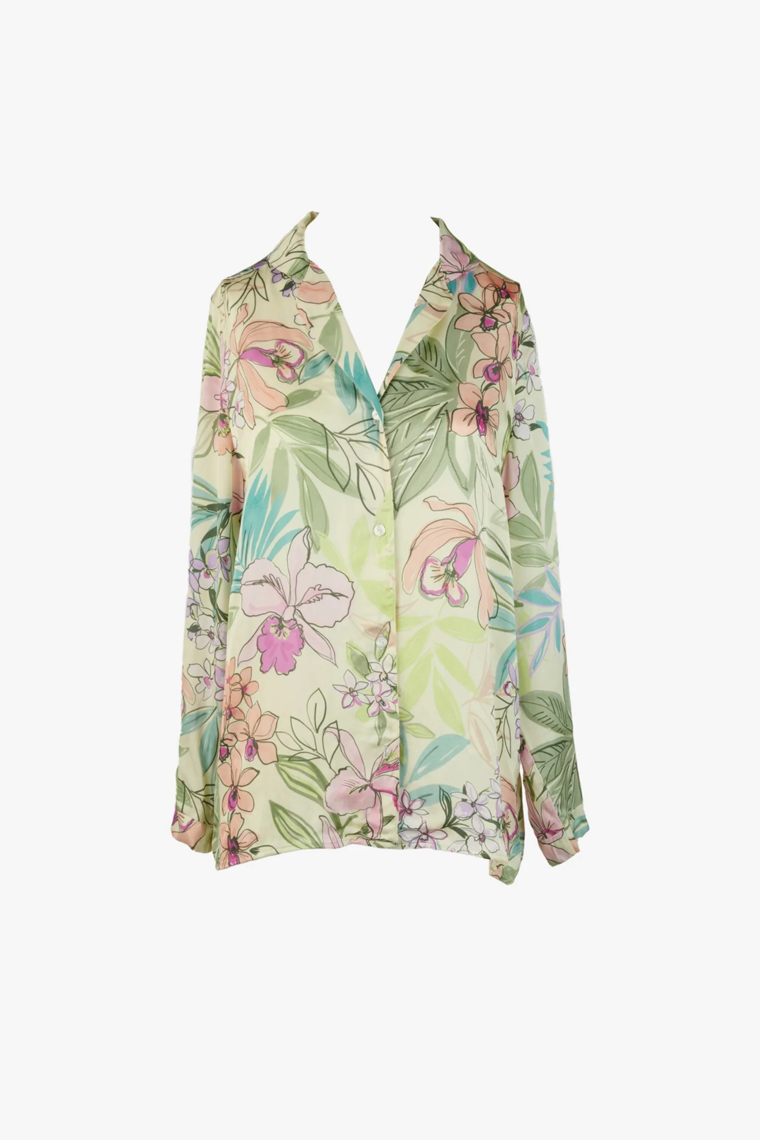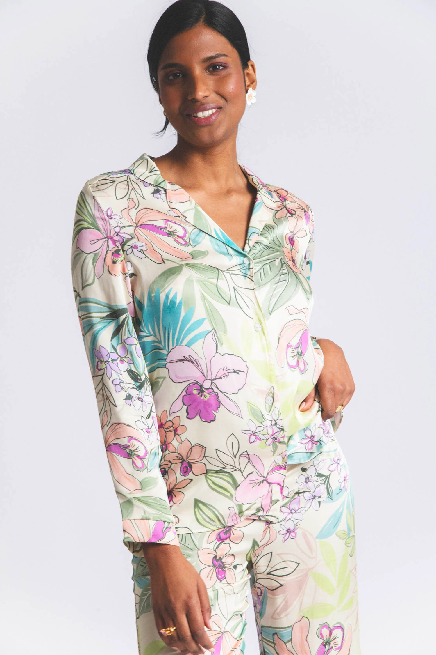 Une chemise imprimée sur fond jaune pâle, chic et confortable, à porter de jour comme de nuit.