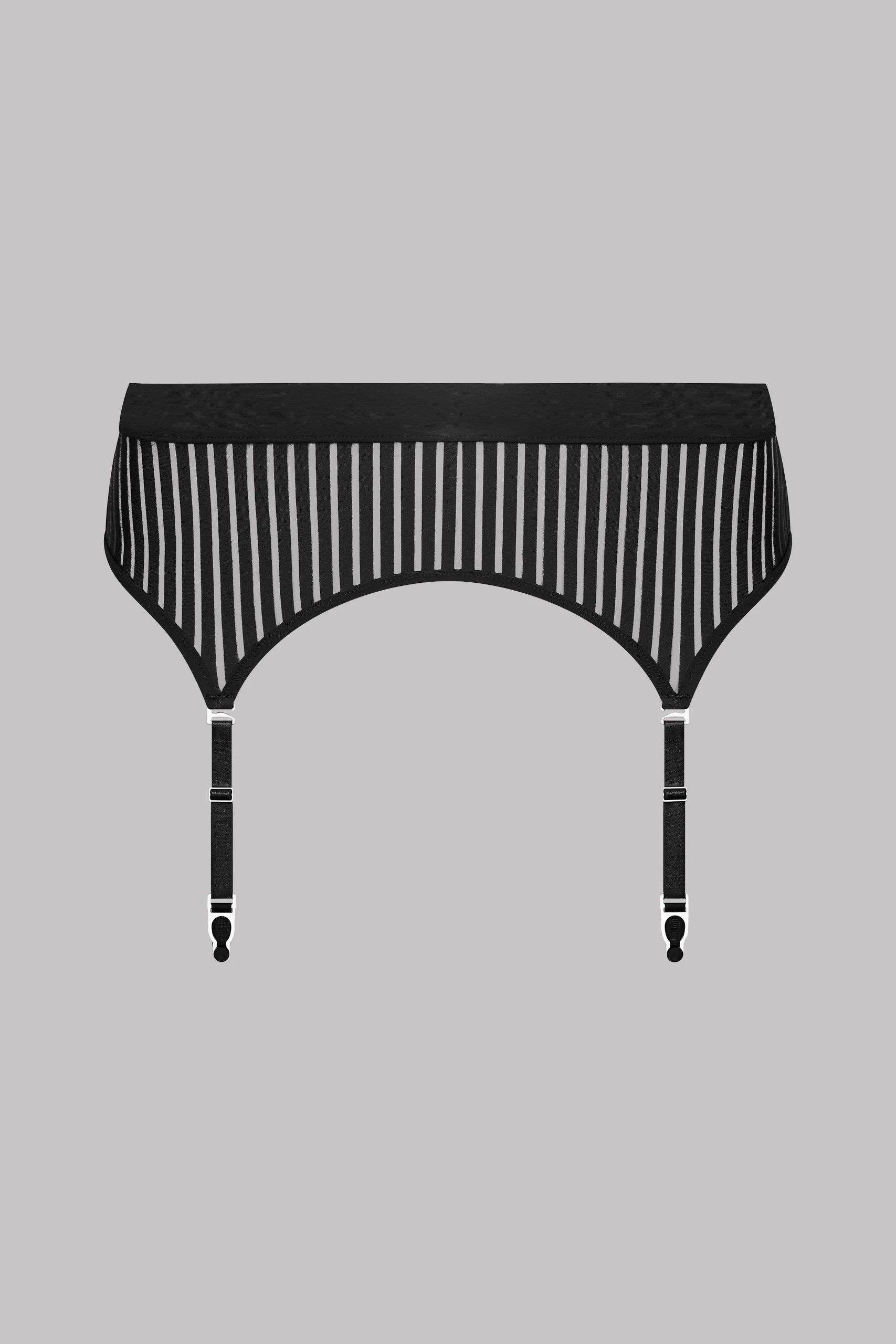 Porte-jarretelles en microfibre aux rayures ajourées, transparentes et graphiques. Des jarretelles amovibles et réglables aux finitions argentées. Ceinture élastiquée recouverte de microfibre noire unie pour plus de confort. Lignes arrondies pour dessiner les courbes. Fermeture par agrafage ajustable dans le dos.