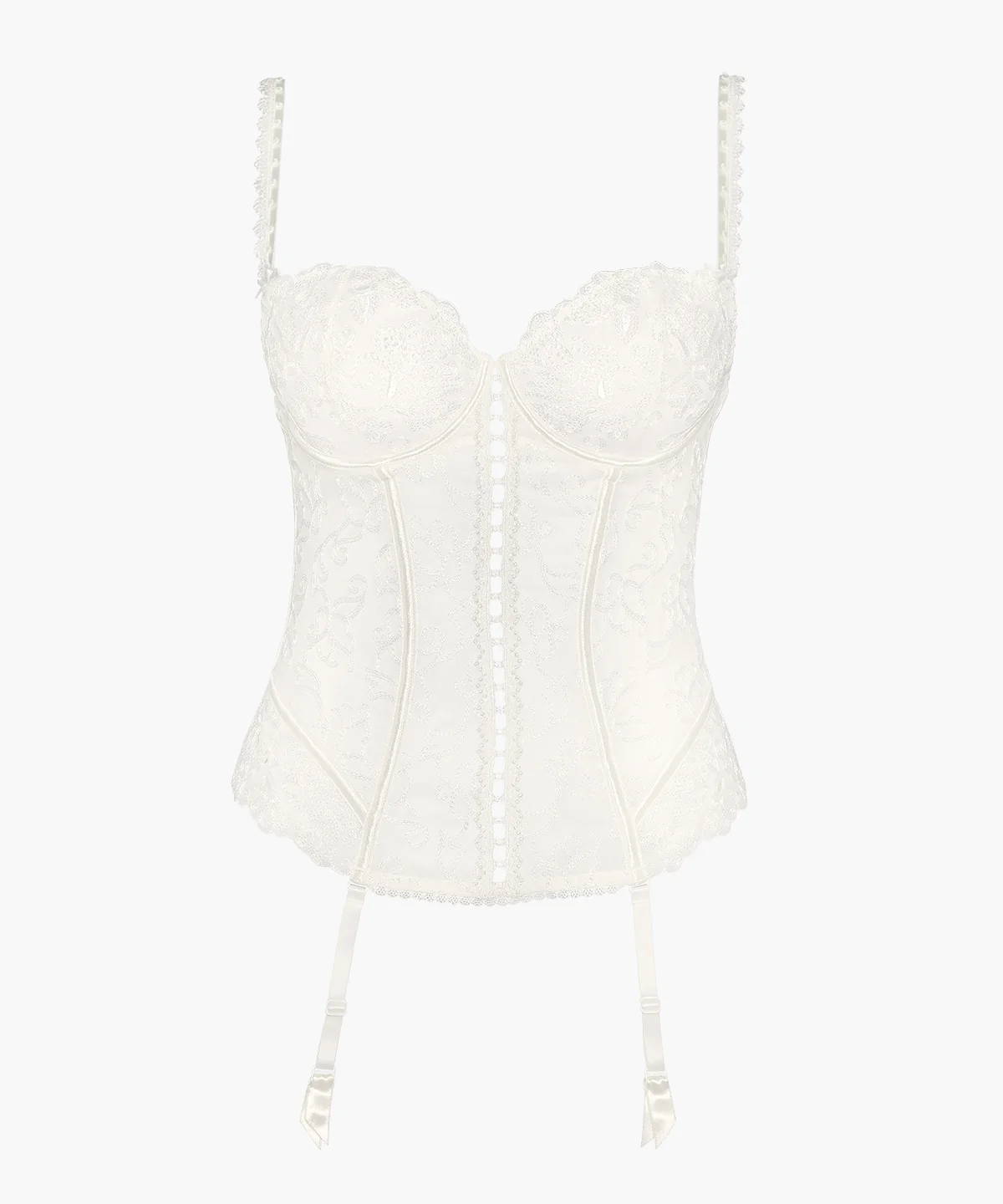 Pièce exceptionnelle de la ligne Pour Toujours, cette guêpière entièrement brodée sublime la silhouette de la mariée par la richesse de sa dentelle. Une fine bande de guipure ajourée laisse deviner la peau, tandis qu’un délicat picot élastique ajoute une touche vintage et charmeuse au modèle.