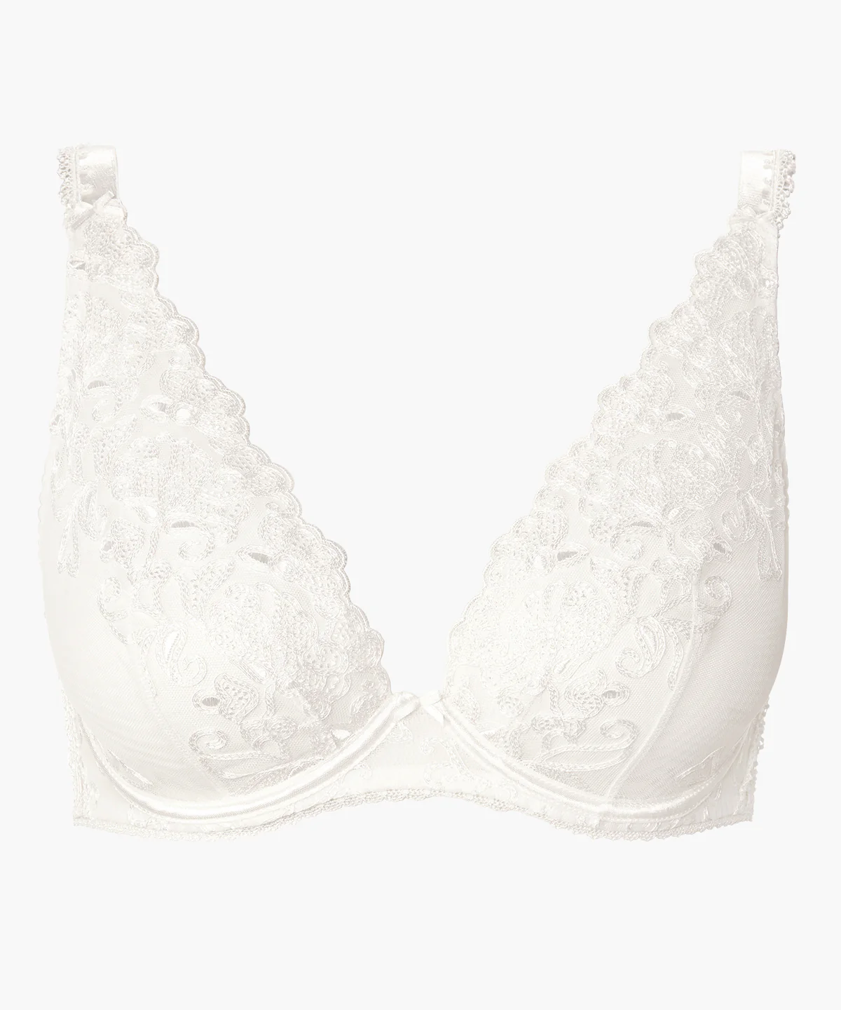 Le décolleté profond et sexy offre sa séduction aux poitrines les plus généreuses. Jusqu’au bonnet F, le soutien-gorge Triangle Plunge Confort déploie sa féminité dans le romantisme de la broderie Cornely. De riches bretelles doublées d’une guipure coordonnée encadrent la poitrine.