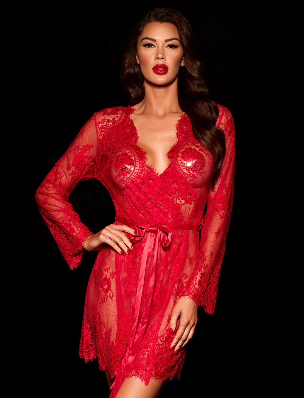 Racy red and lace all over, this stunning sheer robe features soft eyelash lace and a smooth satin waist tie. Drape overtop of your lingerie for a red-hot reveal or slip on the shoulders for making coffee in the morning.