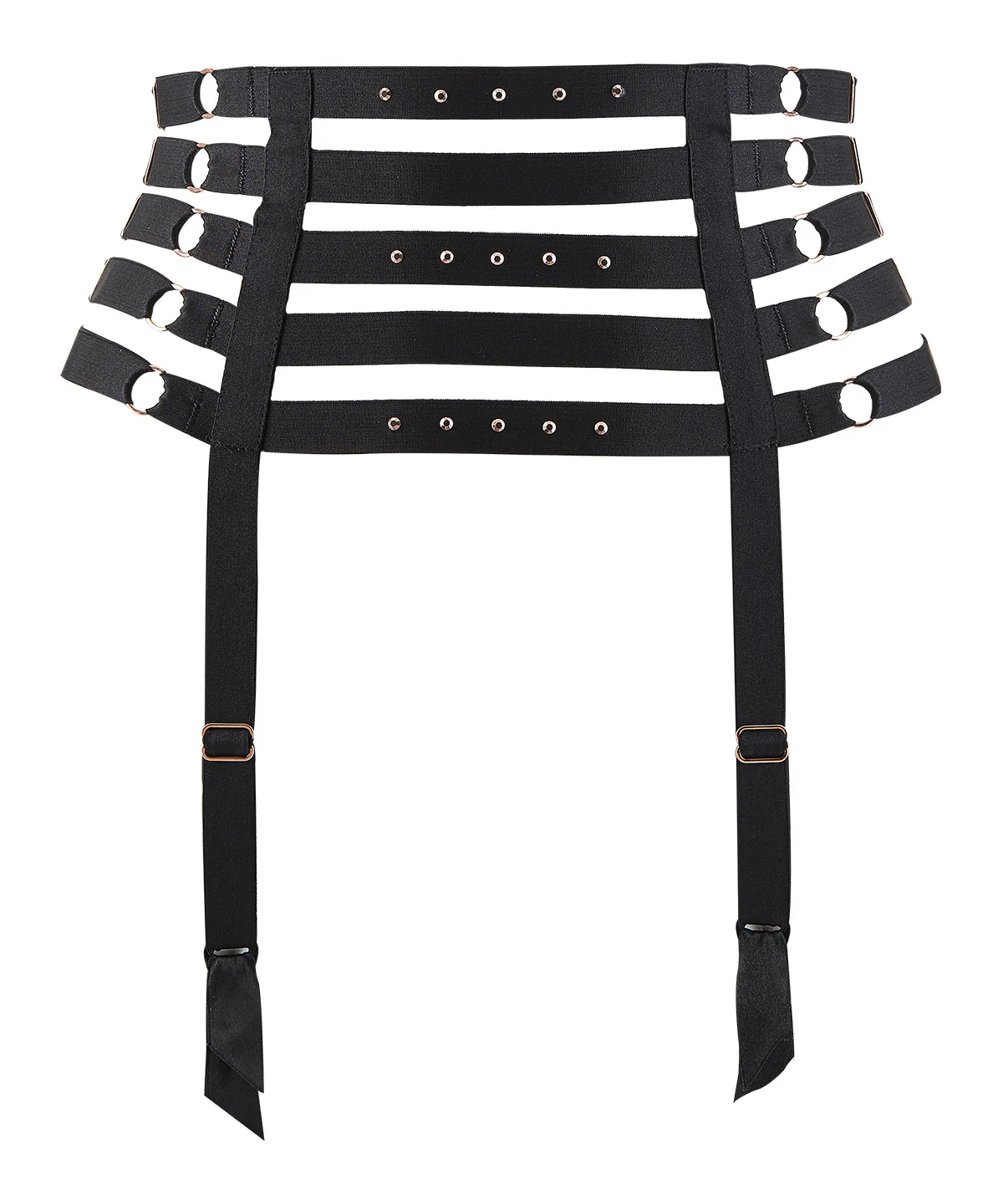 Ce spectaculaire serre-taille complète avec brio la collection capsule Rencontre Anonyme. Plus large que le porte-jarretelles, il sublime la taille telle un amour pris en cage, les mille lanières très graphiques serties de clous métallisés sont autant d’invitations aux ébats amoureux, dans une rencontre du corps qui confine à l’érotisme.