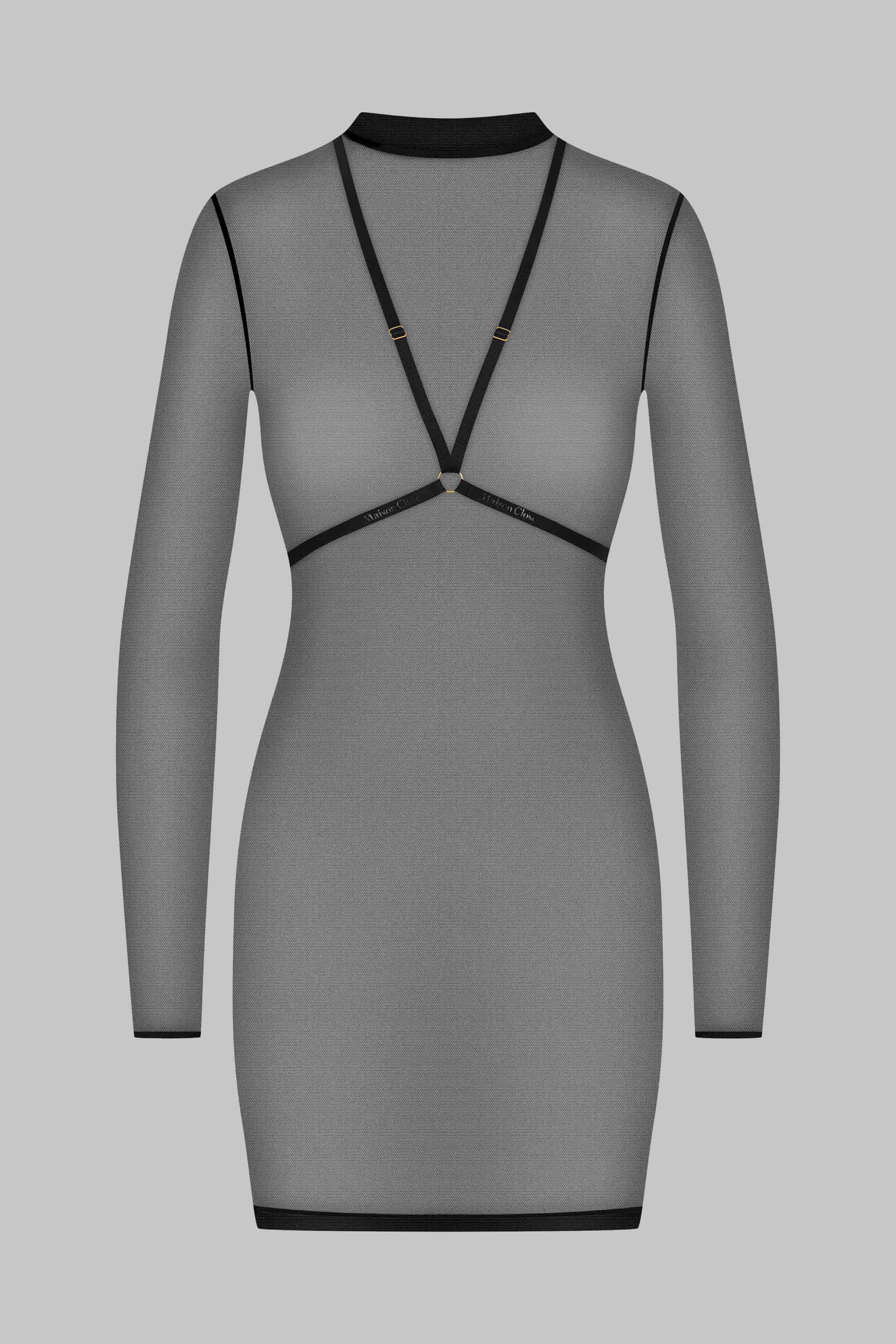 La robe courte manches longues au coloris noir se pare d’un tulle doux à la transparence irisée.