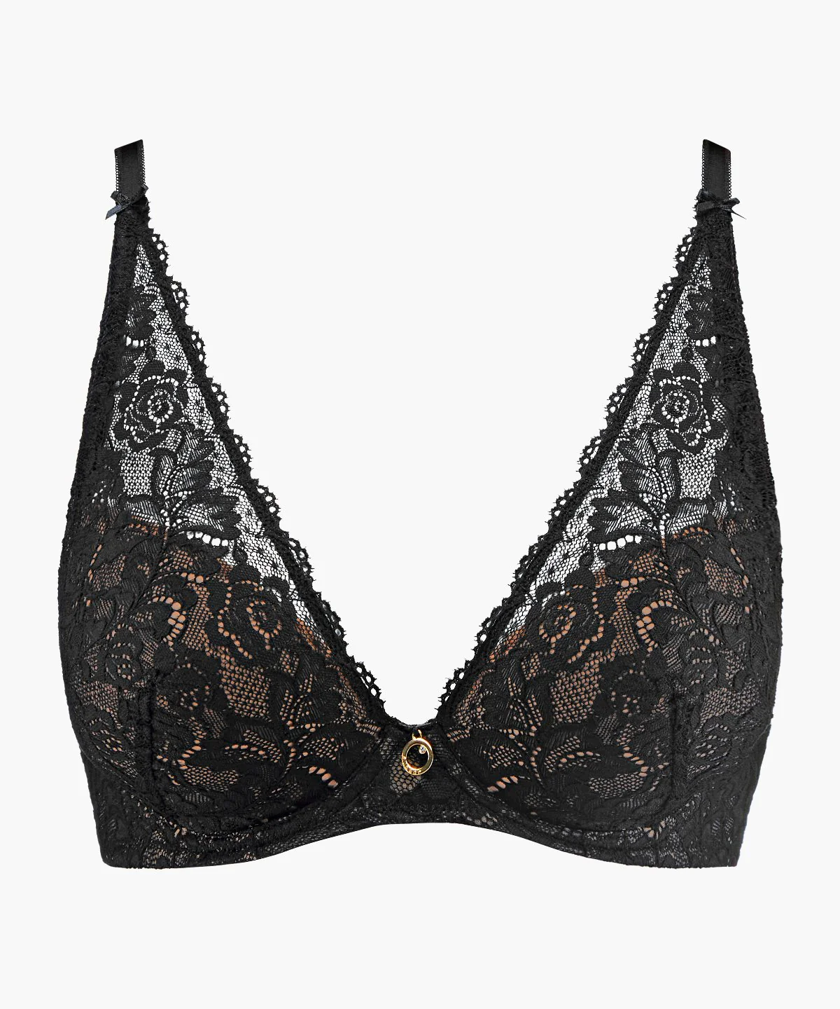 Tout en contraste entre opacité et transparence, le soutien-gorge plunge foulard Rosessence présente une dentelle remontant haut sur la poitrine pour en souligner le galbe et offrir un décolleté très sexy. Derrière, le dos adopte une ouverture en « tour Eiffel » qui assure confort et maintien au quotidien.