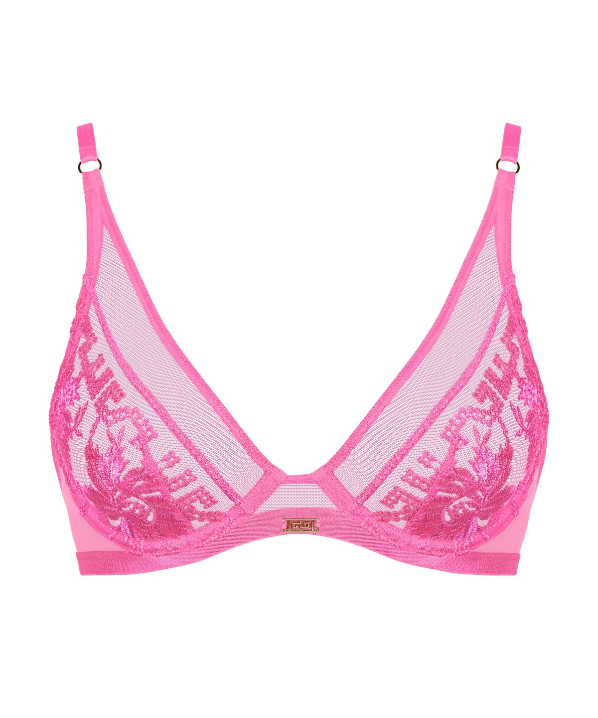 Tout en jeux de transparence, le soutien-gorge triangle armatures Rules of Attraction offre une forme sexy et confortable. Habillant tout le buste de sa broderie florale exclusive, il présente un décolleté profond résolument sensuel, encadré par des anneaux dorés au départ des bretelles et un bijou résolument moderne à l’entregorge.