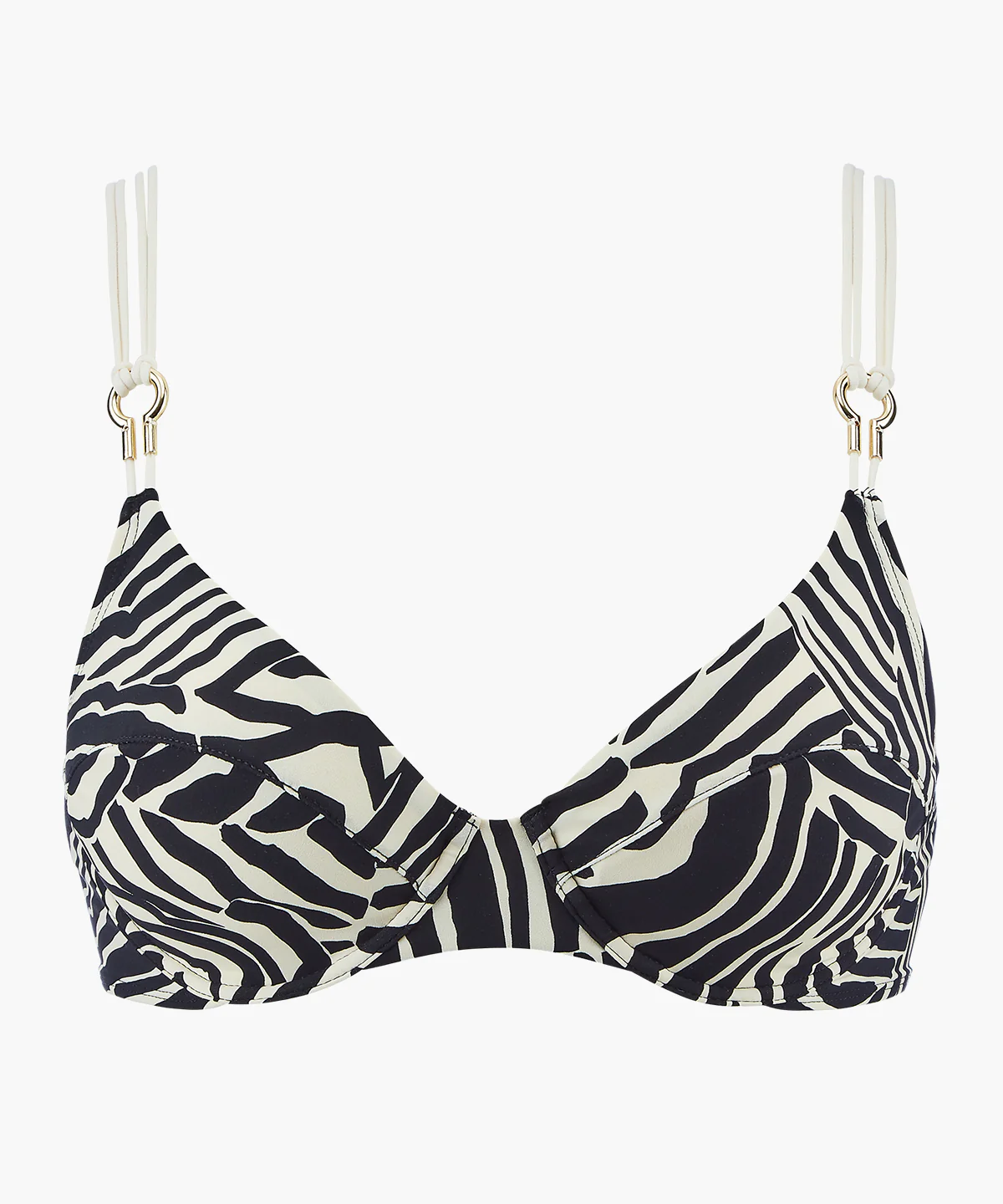Très tendance, pensé pour assurer un maintien et un confort absolu jusqu’au bonnet E, le haut de maillot de bain balconnet Savannah Mood se pare d’un motif animal graphique dans une matière recyclée élégante. Sexy, il offre un décolleté ouvert et séduisant, illuminé par des anneaux dorés retenant les doubles bretelles, façon liens, qui, dans le dos, se portent, au choix, droites ou croisées pour un jeu de style, entre raffinement et sensualité.