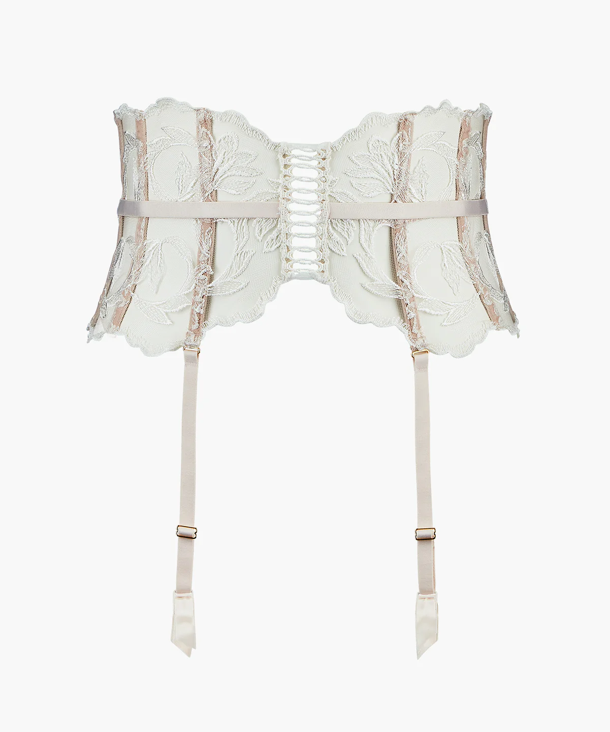 Pensé pour compléter harmonieusement les parures de lingerie délicates et sensuelles de cette collection d’exception et leur apporter une touche sexy incomparable, le serre-taille Season of Love est une pièce spectaculaire, pouvant se porter avec ou sans bas. Structurant et galbant la taille, il allonge la silhouette grâce à sa broderie florale transparente et brillante, à ses coutures verticales et à ses jarretelles amovibles, rehaussés d’anneaux dorés qui illuminent la peau.